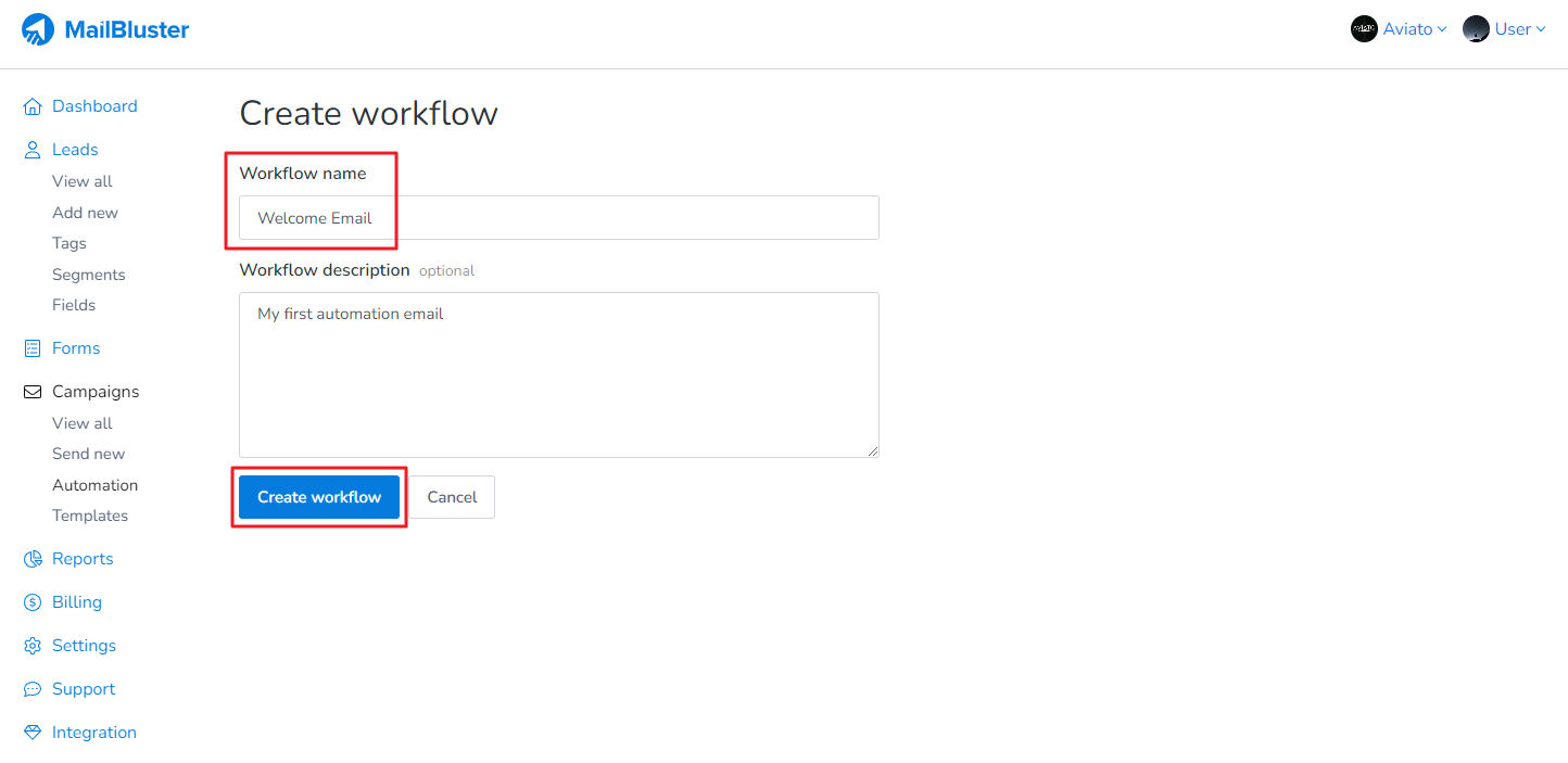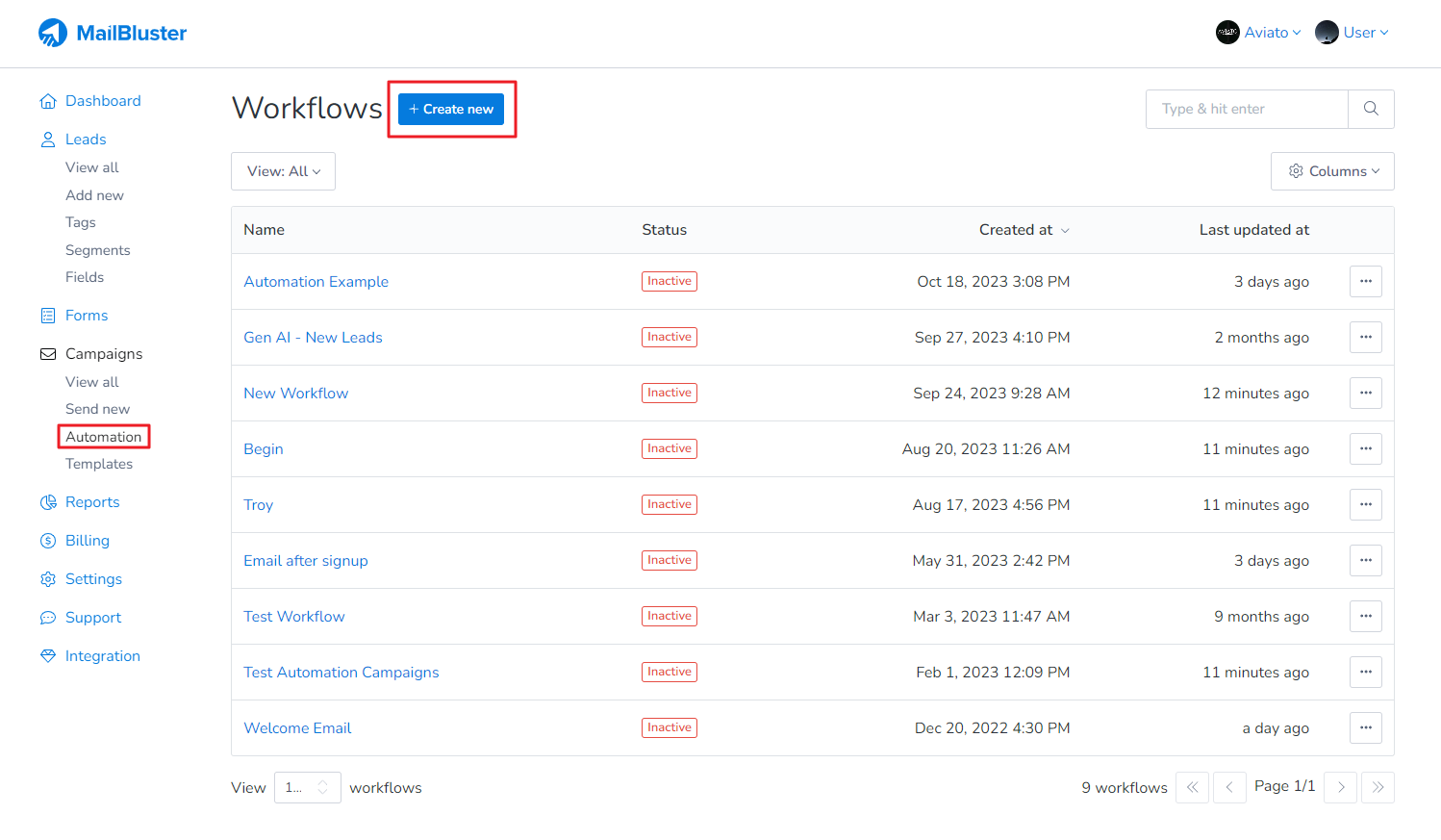 1. To send Welcome Email from MailBluster, first go to Automation under Campaigns. Click on Create new.