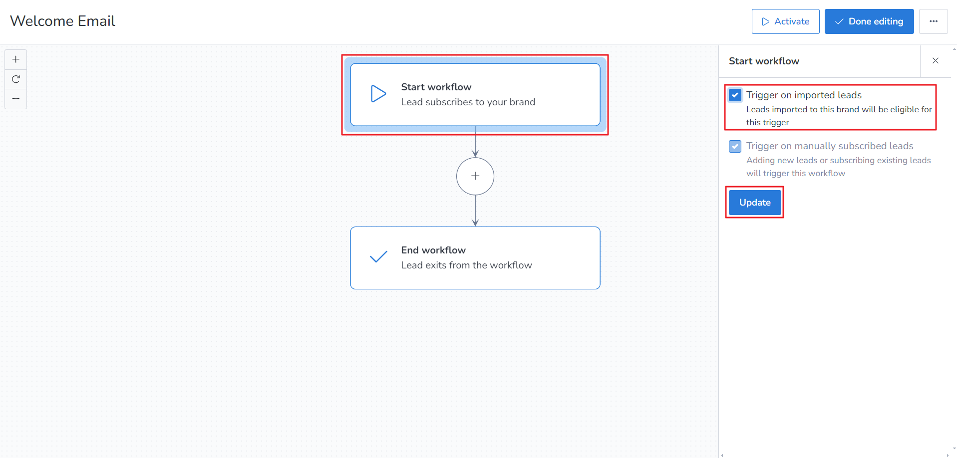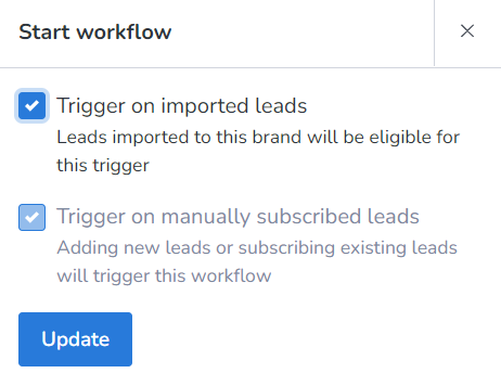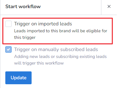 3. Click on the Start workflow and tick the checkbox Trigger on imported leads and then click Update button.