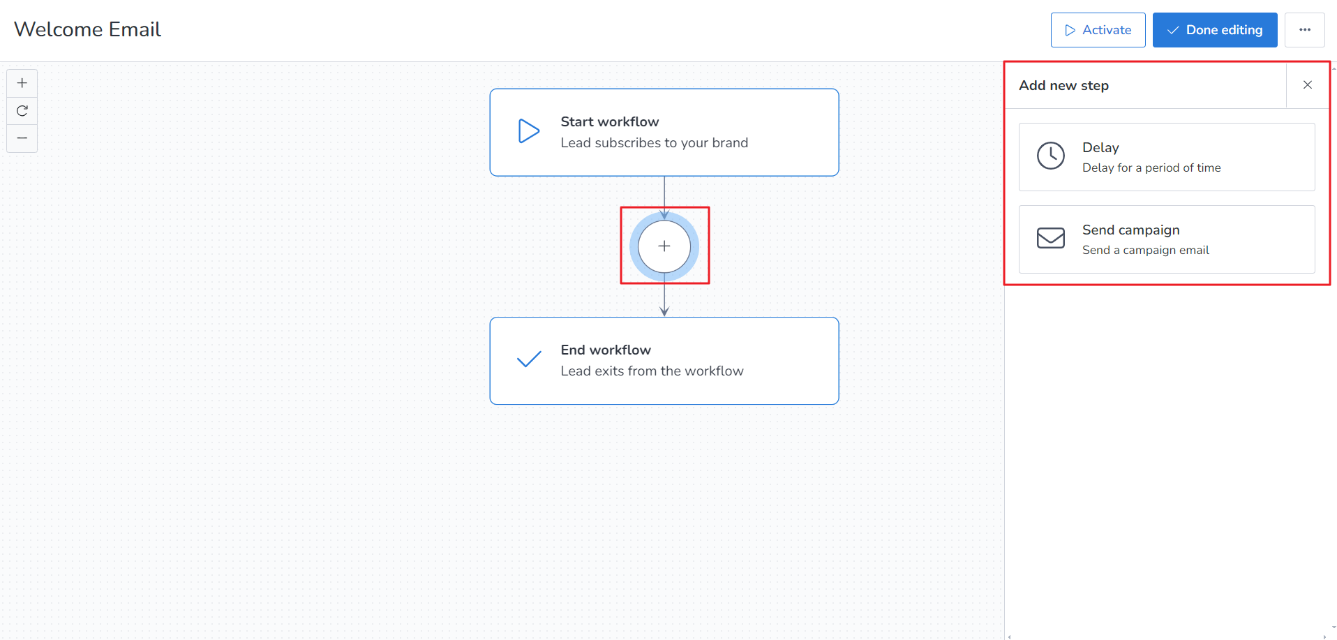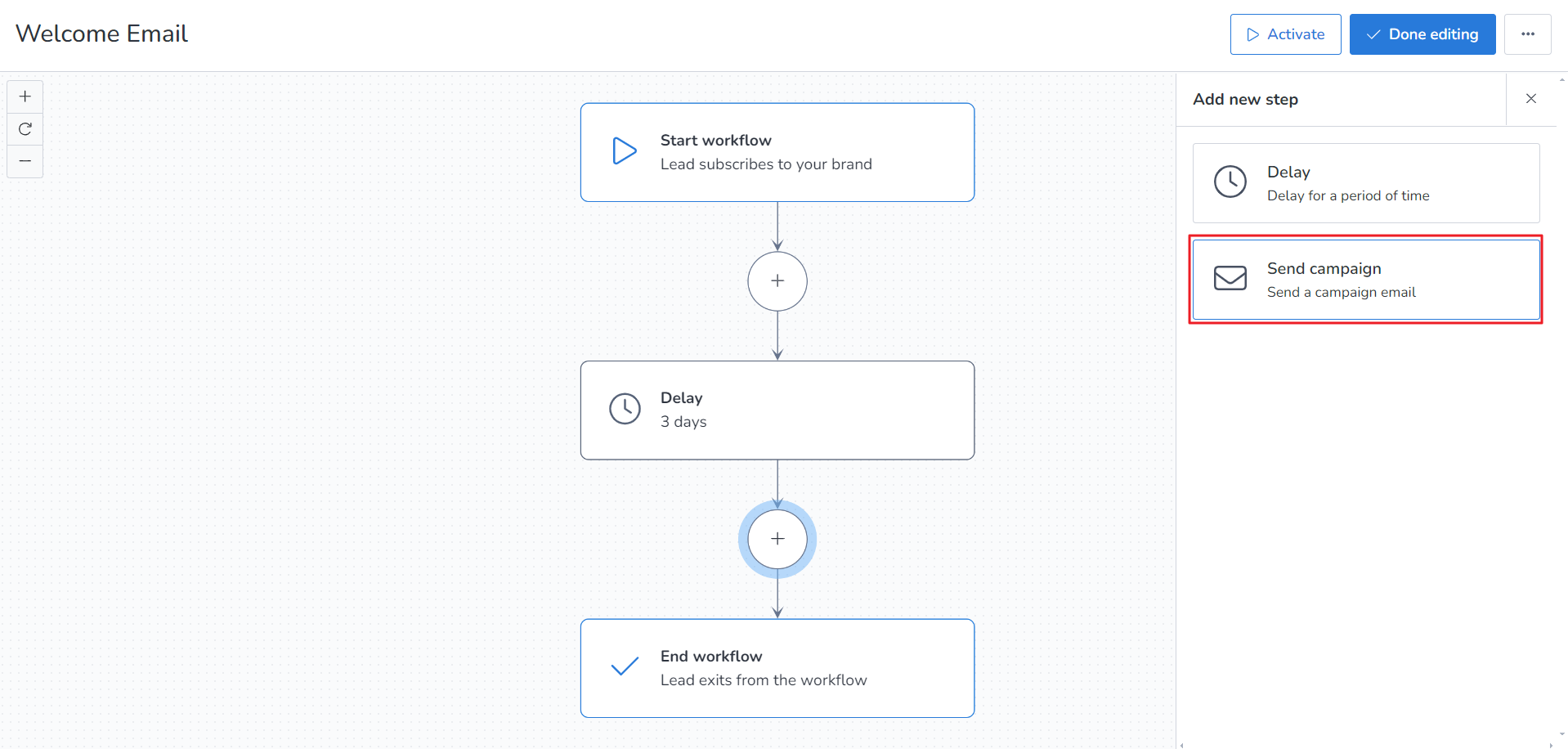 4. Now click on the circular “+” sign and under Add new step, you will get two options: Delay and Send Campaign. Delay allows you to set schedule for that campaign while Send campaign allows you to set the campaign for sending.