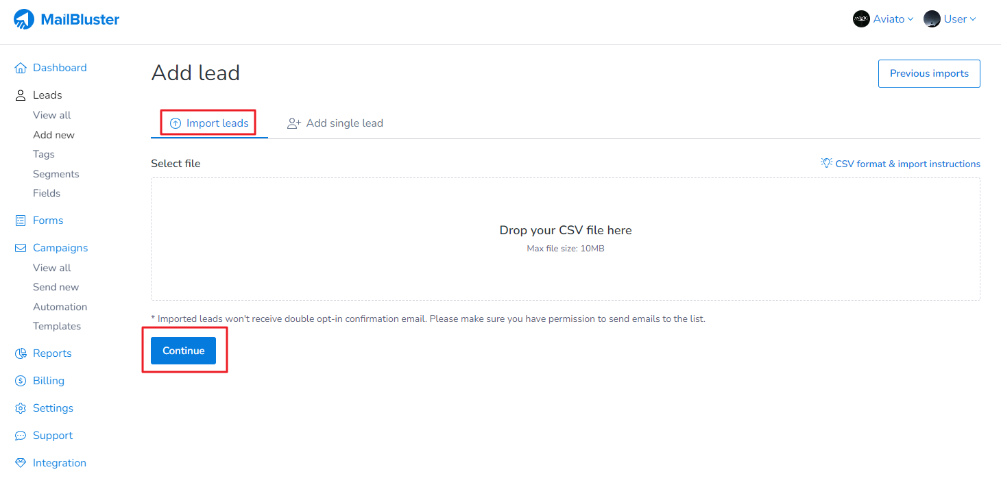 13. Now import new leads (who has just subscribed) from Add new > Import leads and attach a CSV file then click Continue.