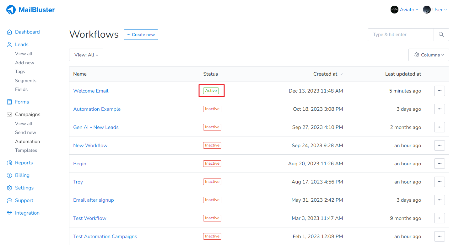 15. Make sure the Workflow remains Active while you import new subscribed leads into MailBluster.