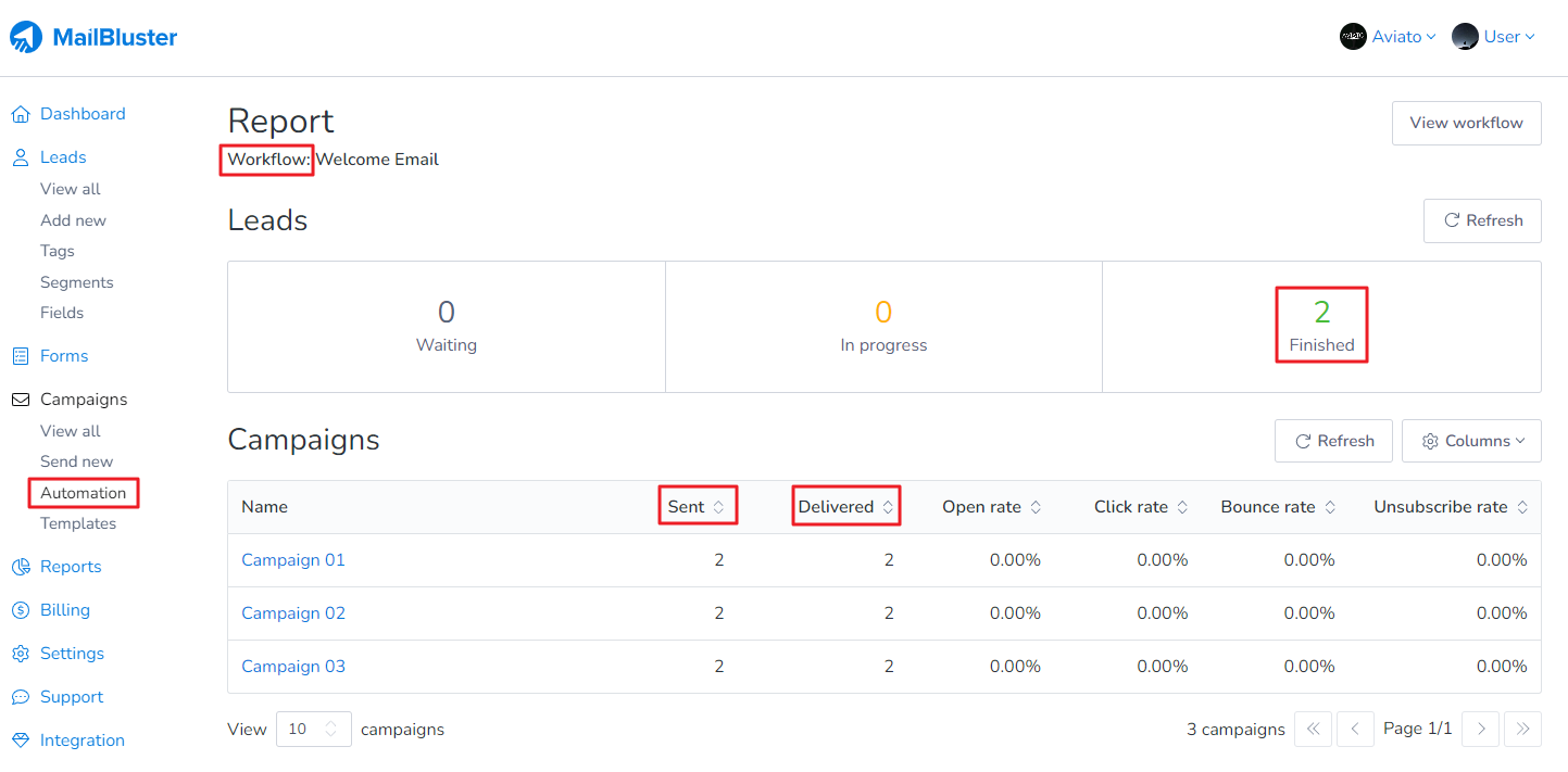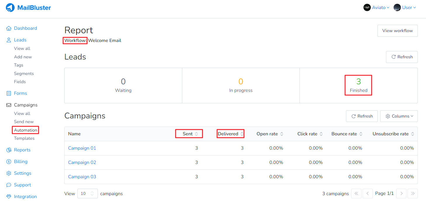 After clicking View report under Workflows, you will see a generated report like this based on your email campaigns set in the workflow: