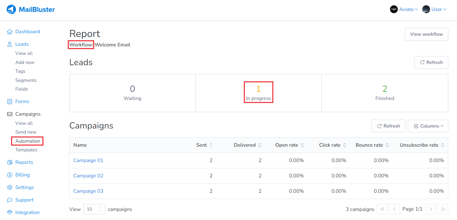 Please note: Automation reports are not generated in the Reports section of MailBluster; they are only available under Automation Workflows.
