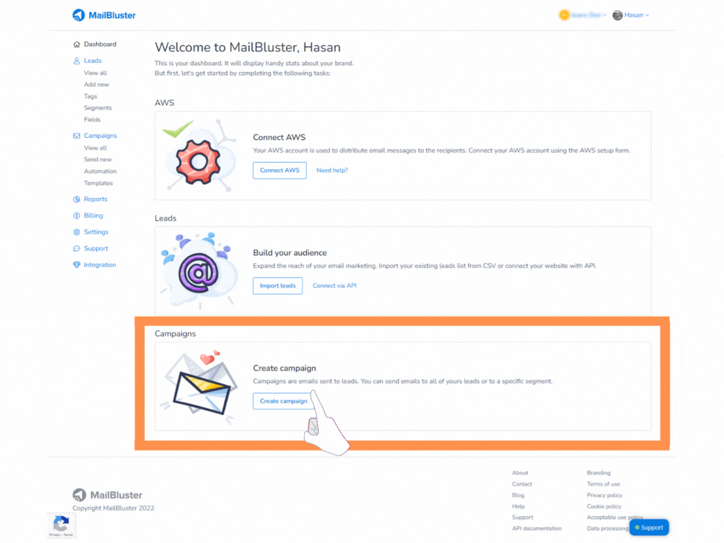 To kickstart your journey with MailBluster, log in using your email and business details and connect your AWS account, which is verified. Once logged in, you’ll seamlessly navigate to the next page, where you can initiate the process by clicking “Create Campaign.”