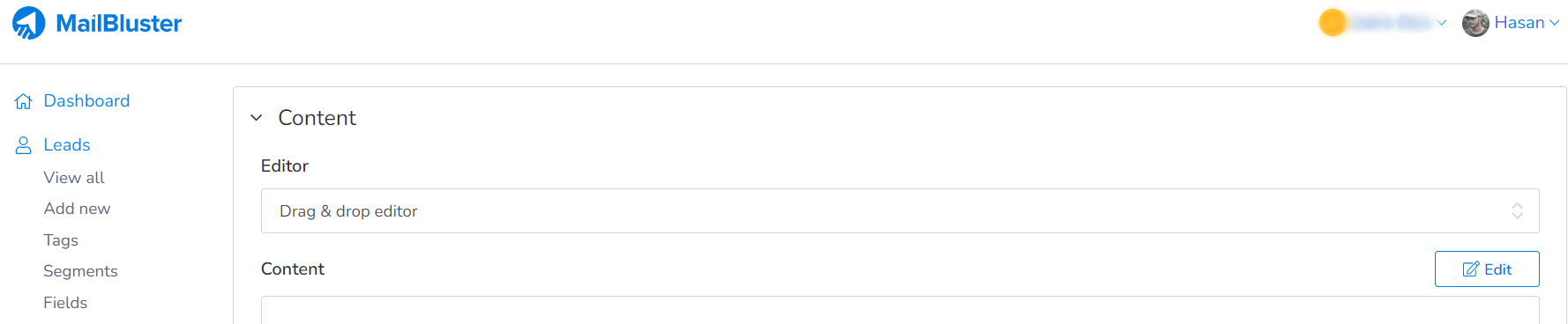 After completing tasks in the “Info” field in MailBluster, navigate to the “Content” field.