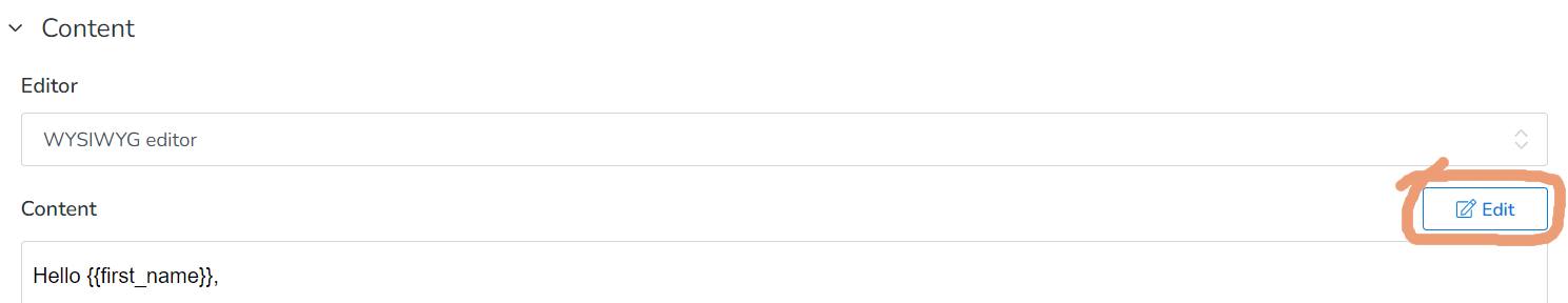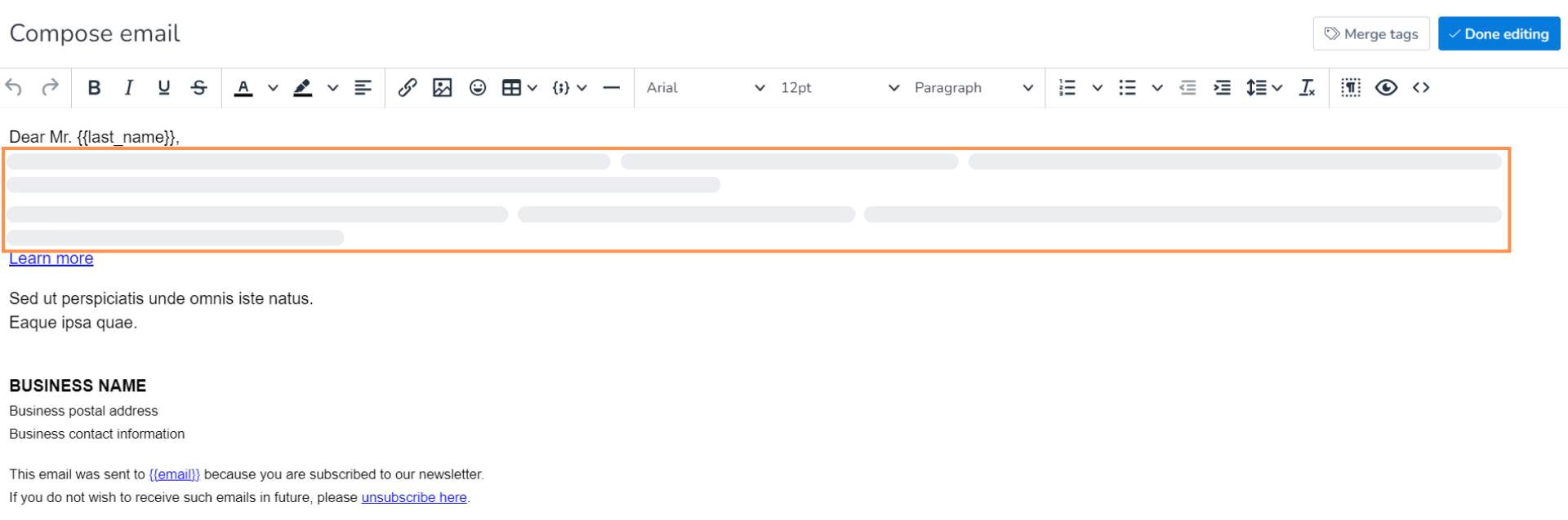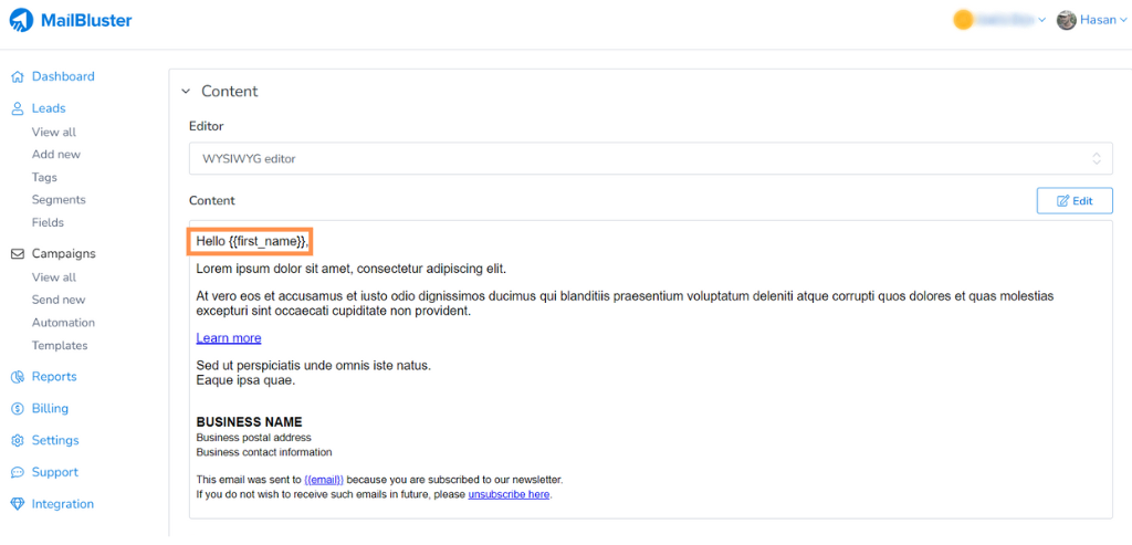 MailBluster offers three editors: Drag & drop, WYSIWYG (what you see is what you get), and HTML. For formal emails, the WYSIWYG editor is recommended. After selection, the content field will appear as shown below, where you can start working on your legal email content, including the salutation.