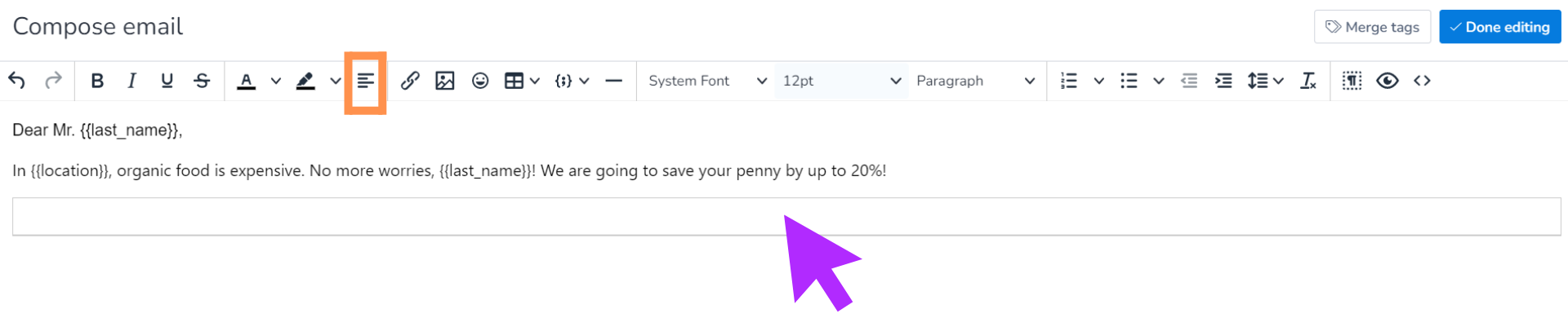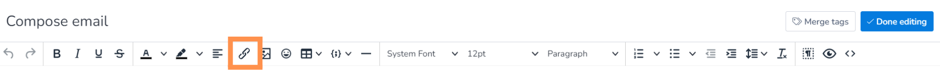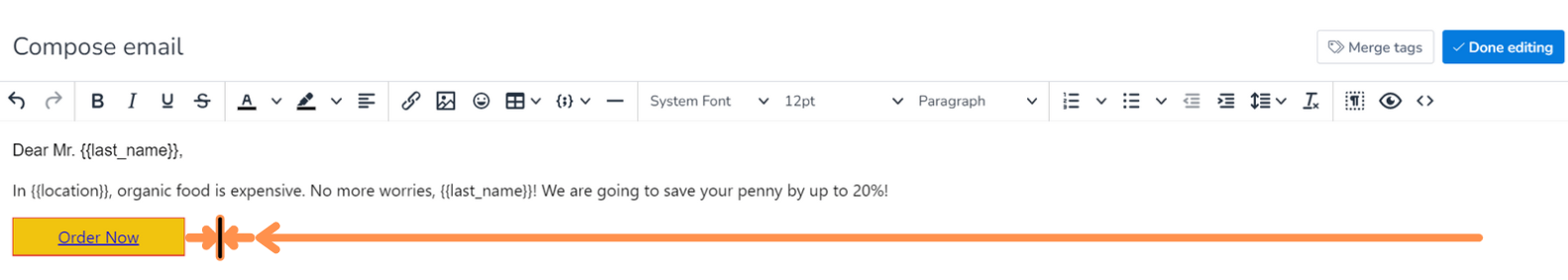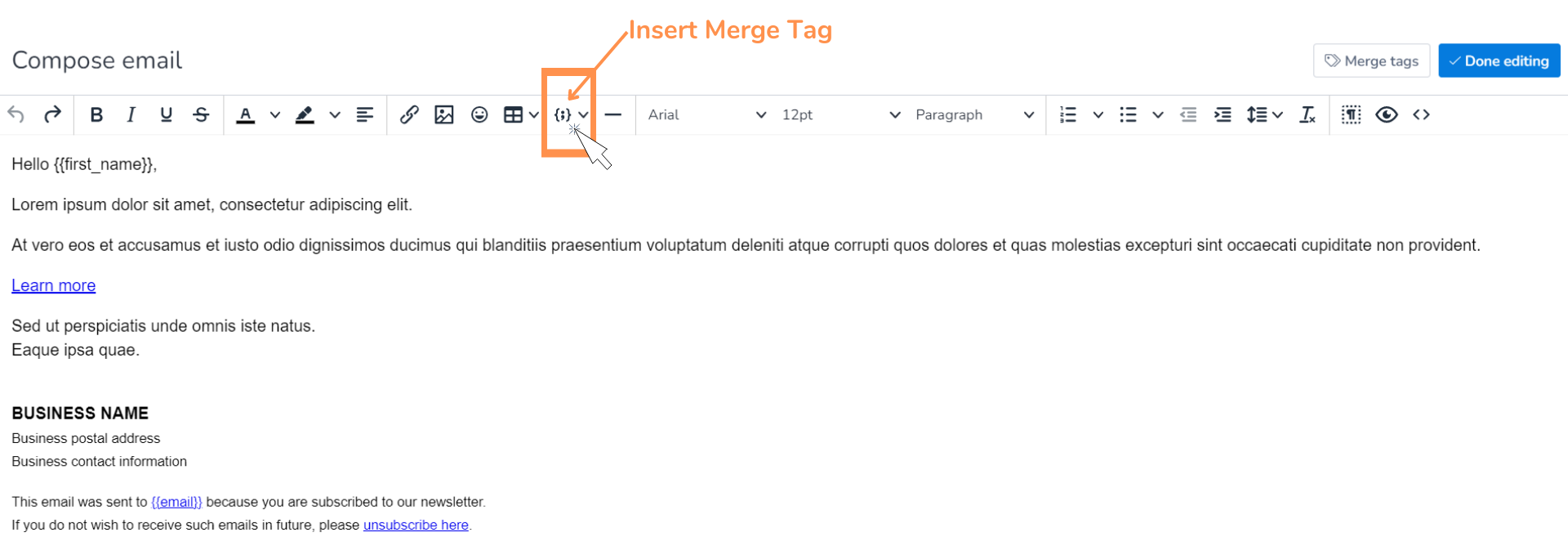 You will be directed to a page like the one below, where you can click the “insert merge tag” icon to personalize your email.