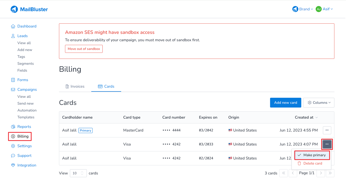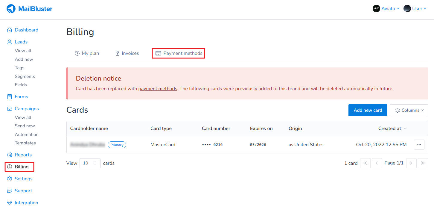 You can add multiple billing cards in MailBluster. But you cannot remove your existing card unless you add another billing card (in this case you need to add a new billing card). Once you add a new billing card and set it as Primary, you can remove the old billing card easily.