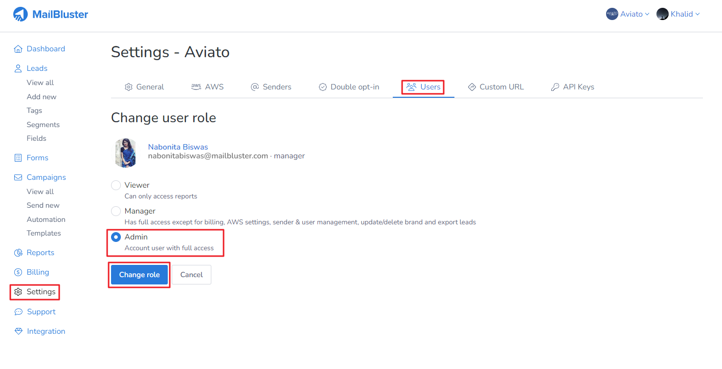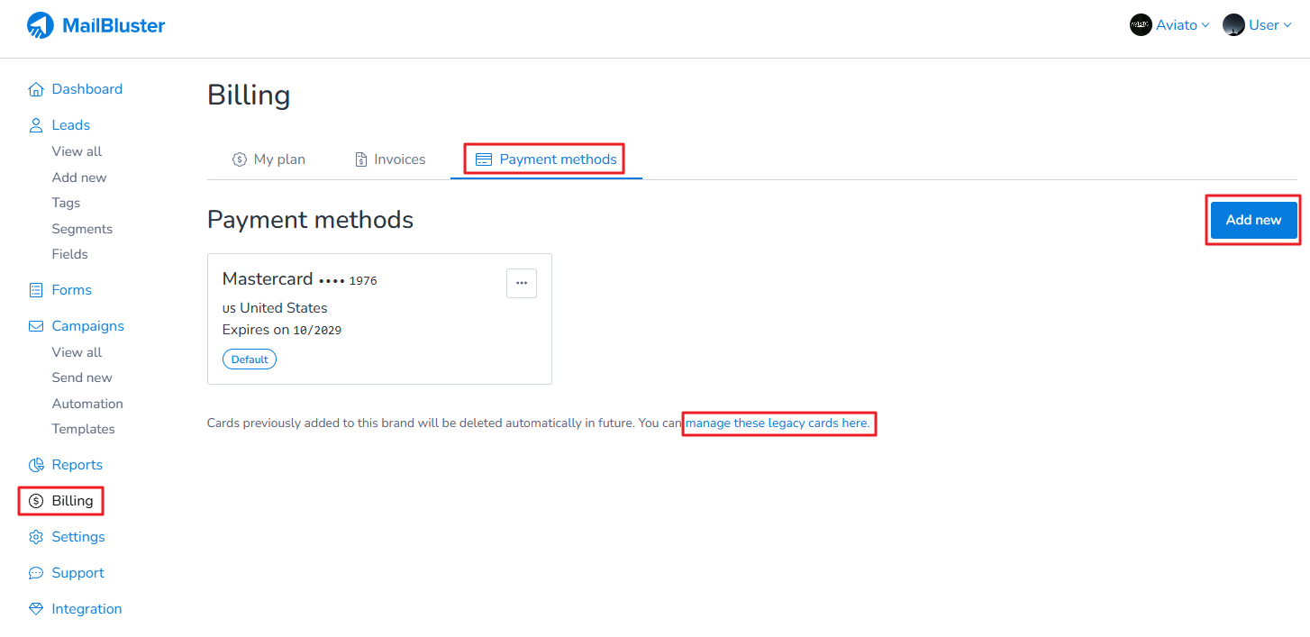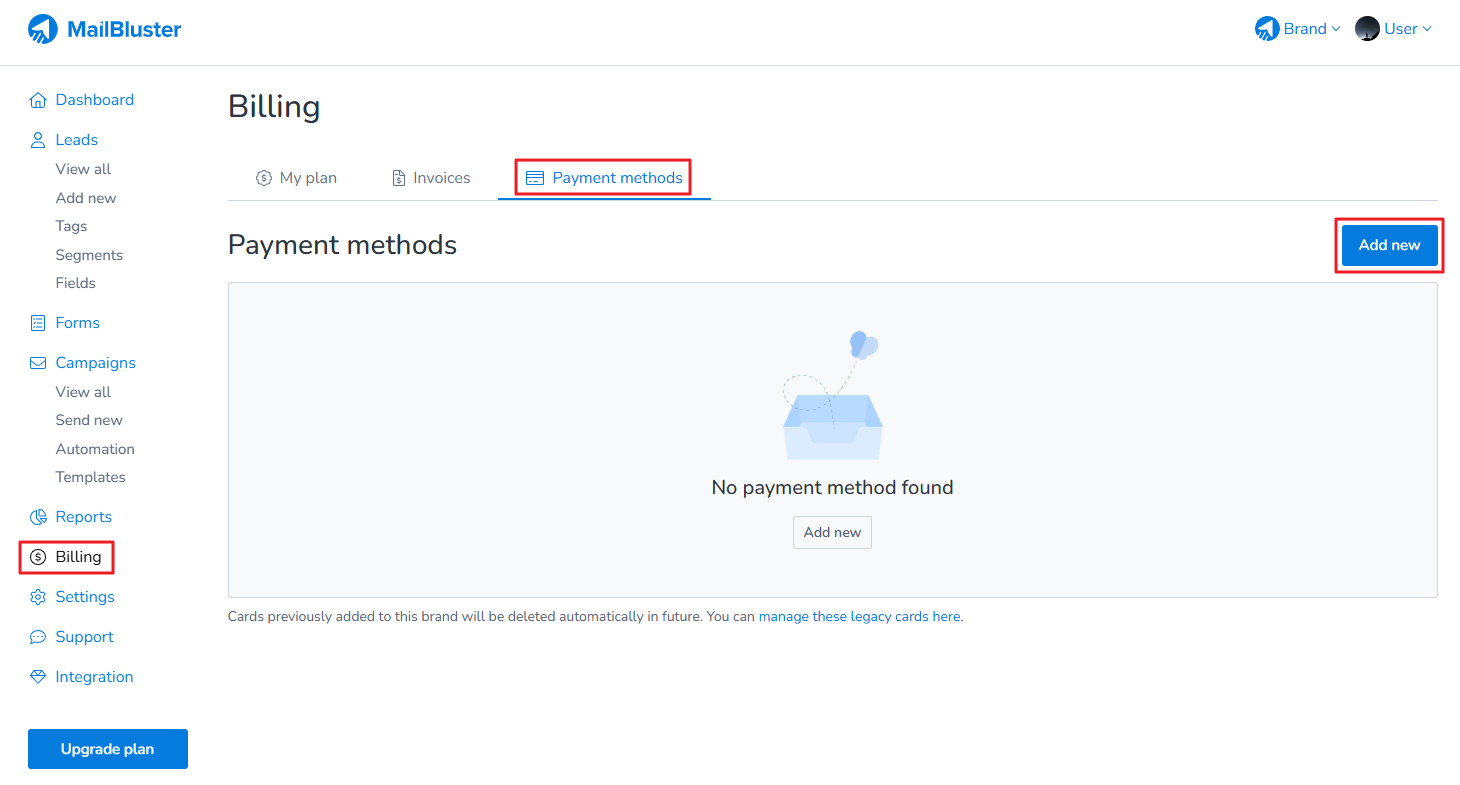 Once that’s done, you’ll be able to access the Billing page from the MailBluster Brand > Billing section.