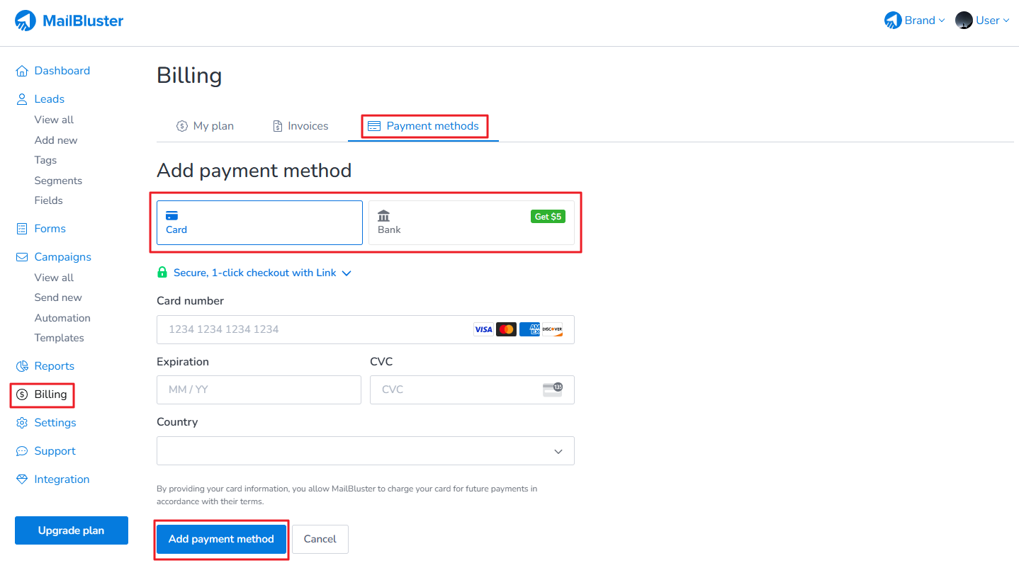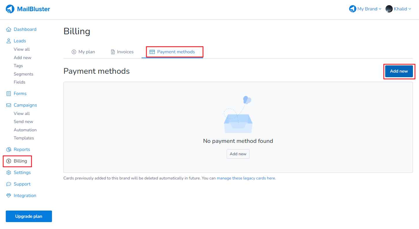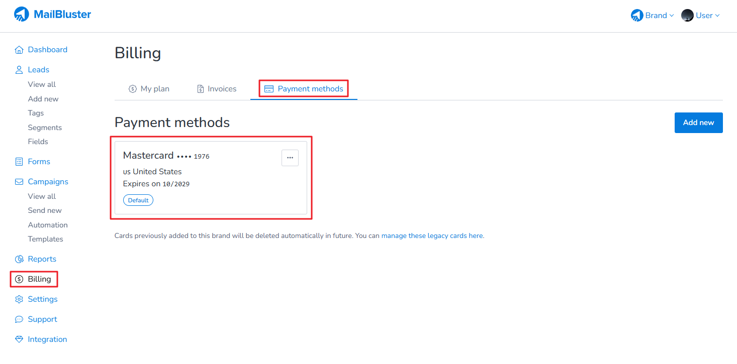 To set up payment method for each of your brand, first you need to go to your Brand. Then go to Billing > Payment methods and click Add new.