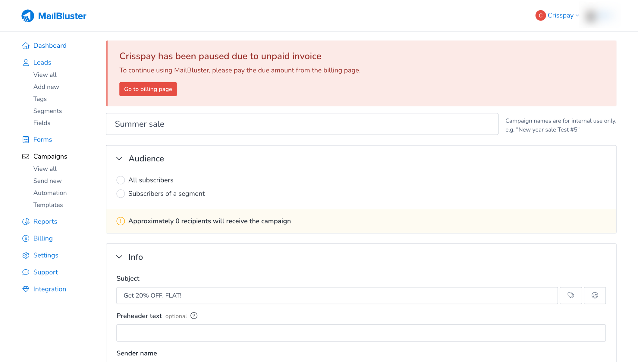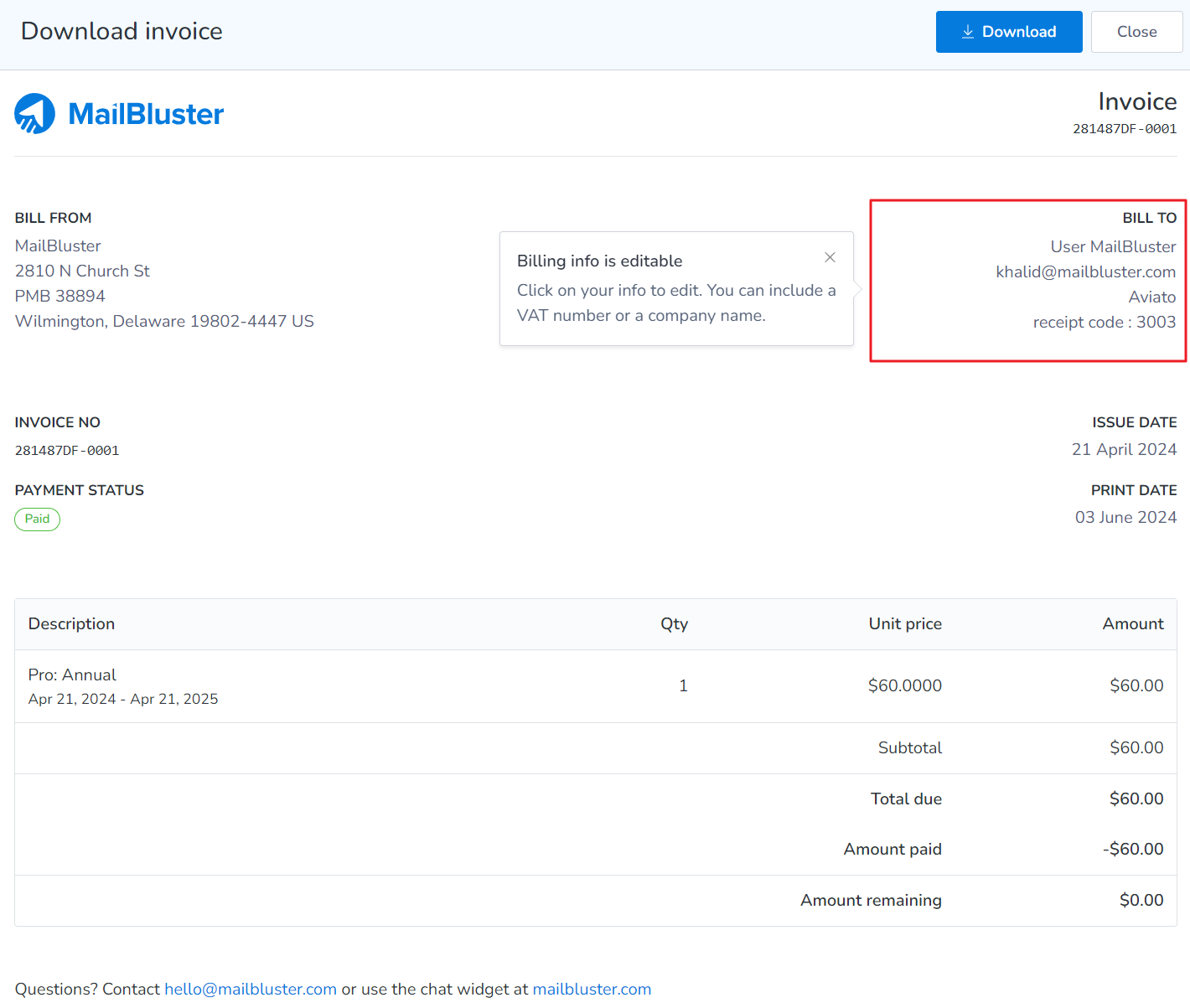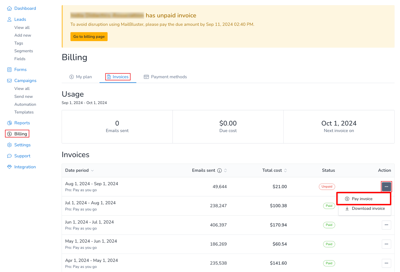 MailBluster uses a secure protocol for payment methods, so it doesn’t automatically charge customers each month. Instead, MailBluster asks for your permission before processing any payments. If you encounter any issues, you can use the ‘Pay Invoice’ button to manually complete any unpaid invoices. MailBluster also now offers a 10-day grace period for unpaid invoices. During this time, you can continue sending campaigns, but you must pay the invoice within 10 days to keep sending emails.