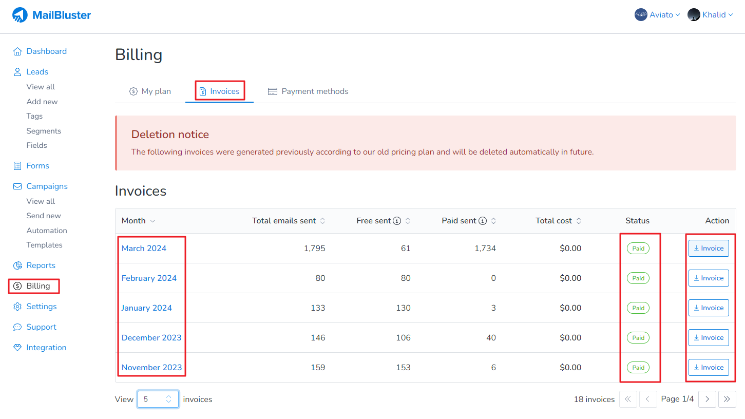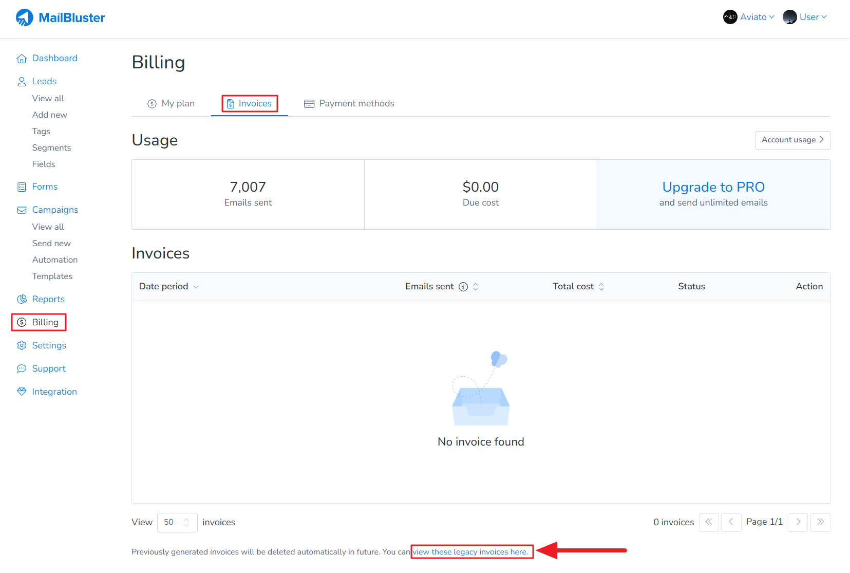 Here is an example of legacy invoice lists which can be found in your Brand in MailBluster.