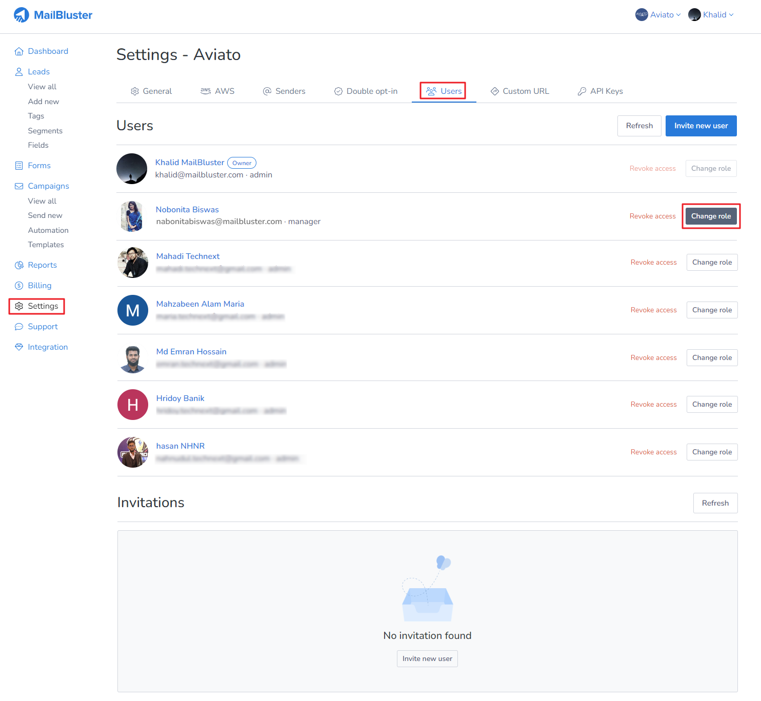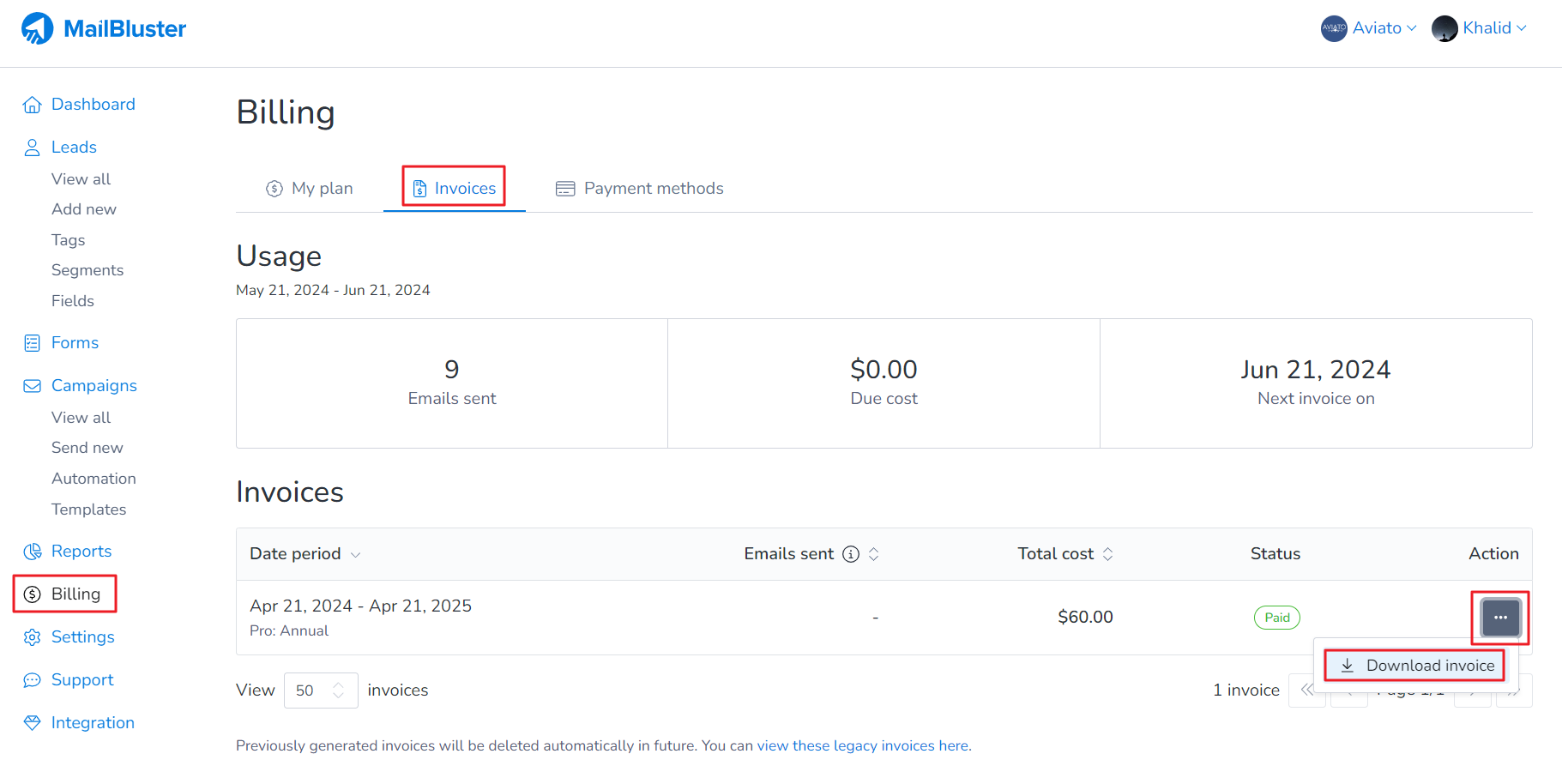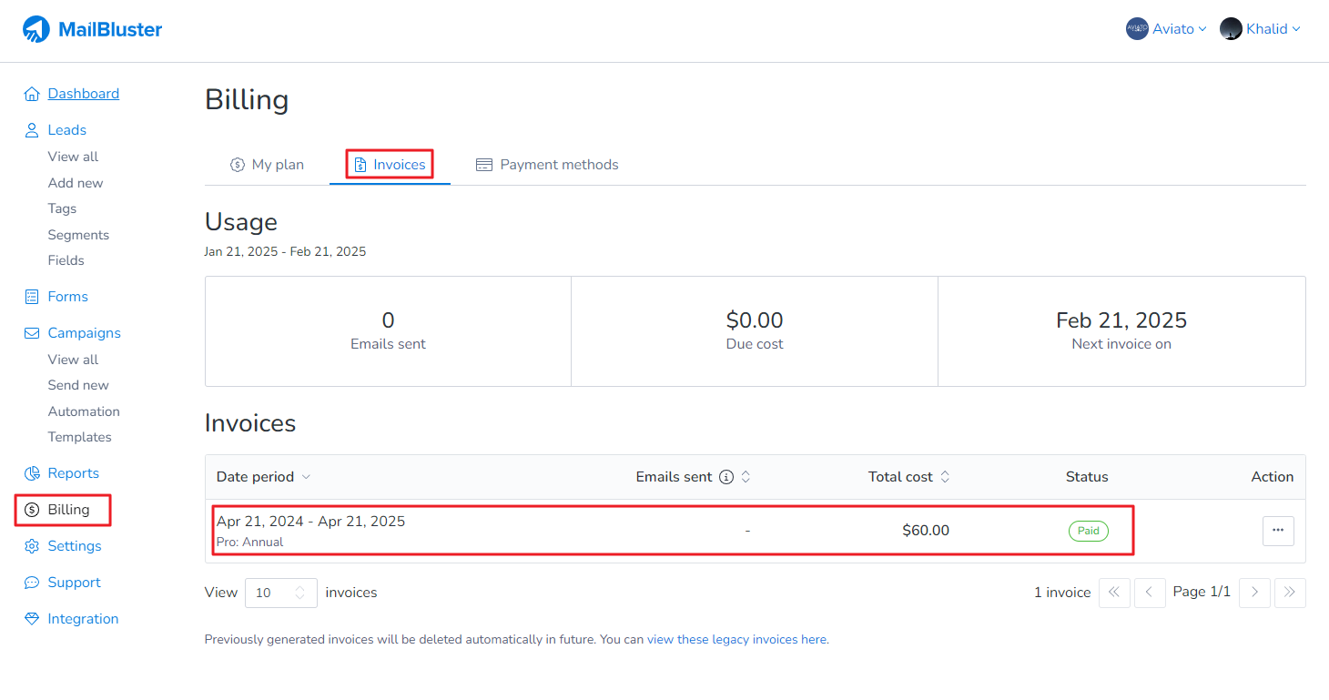 You can find all your monthly invoices under your Brand > Billing > Invoices in MailBluster. You can check whether the payment has been made successfully or the payment status is still pending.