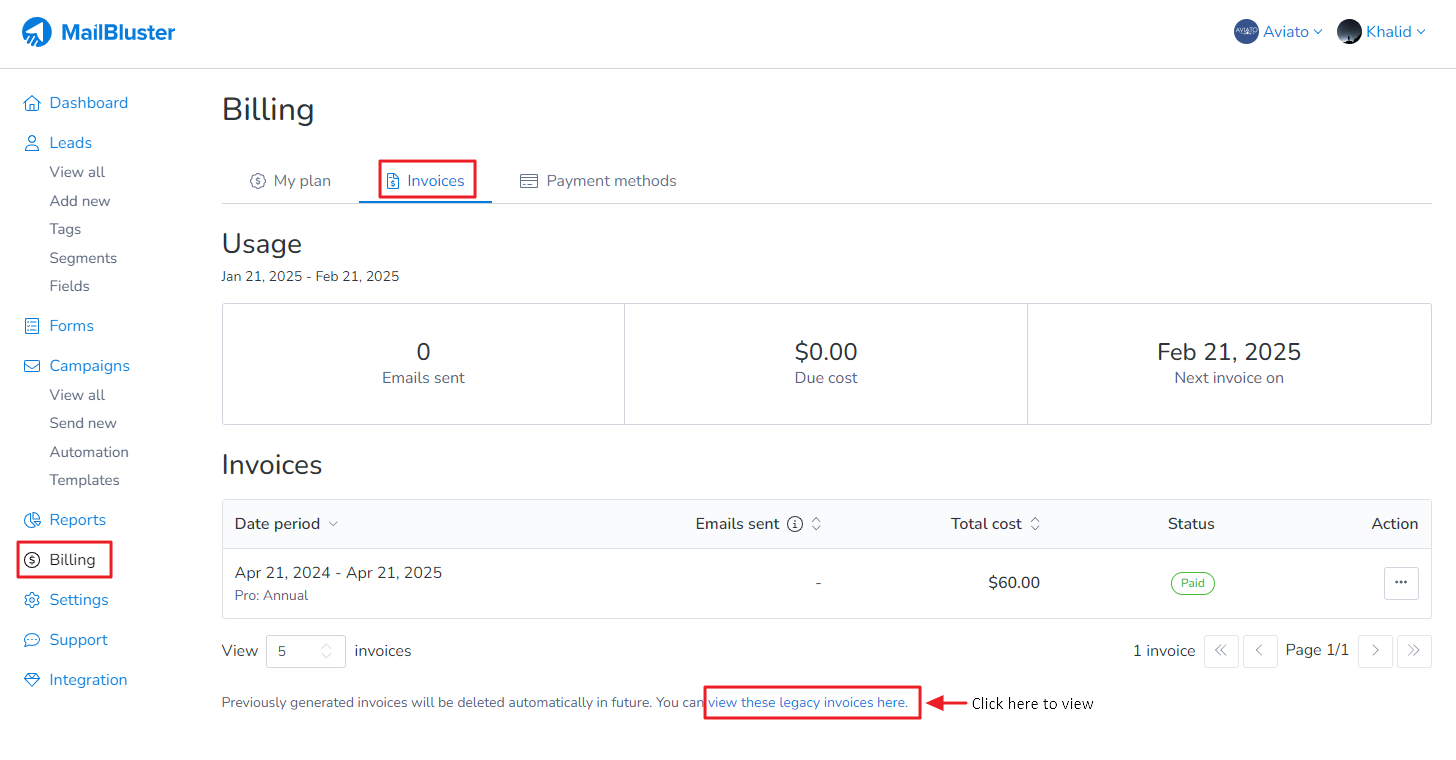 You can also view legacy invoices (if there is any) by clicking on ‘view these legacy invoices here‘ as shown below.