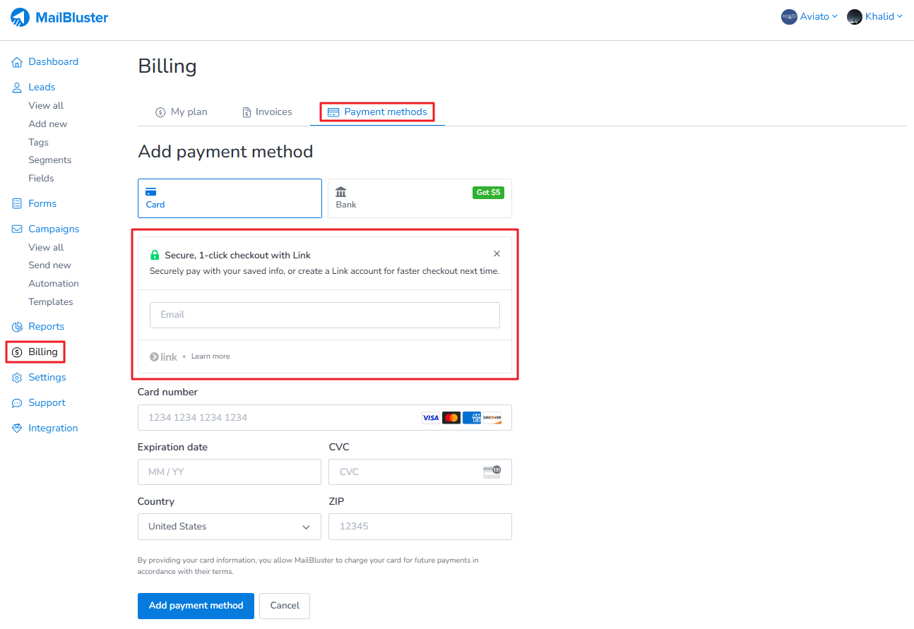 MailBluster supports manual payment through Link. Link is a product of Stripe. Link is a feature that provides a streamlined, secure, and quick checkout experience for customers.