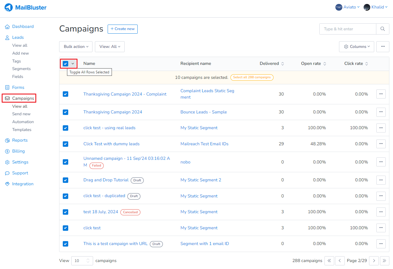 Alternatively, you can bulk archive campaigns by clicking on the checkboxes as shown below.