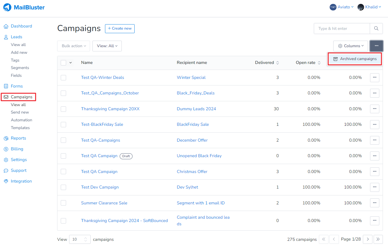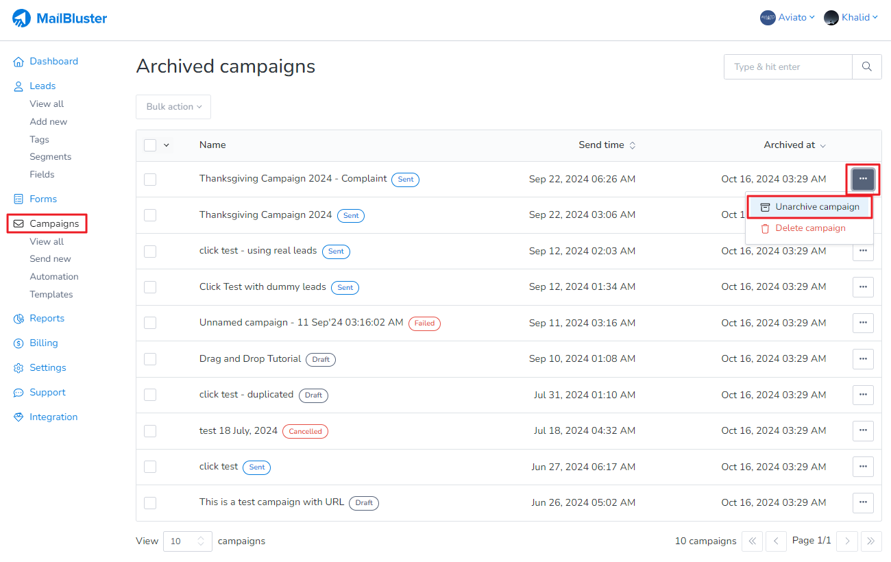 If you want to check the list of archived campaigns, then click on the three-dot ellipses from Campaigns list and click on Archived campaigns.