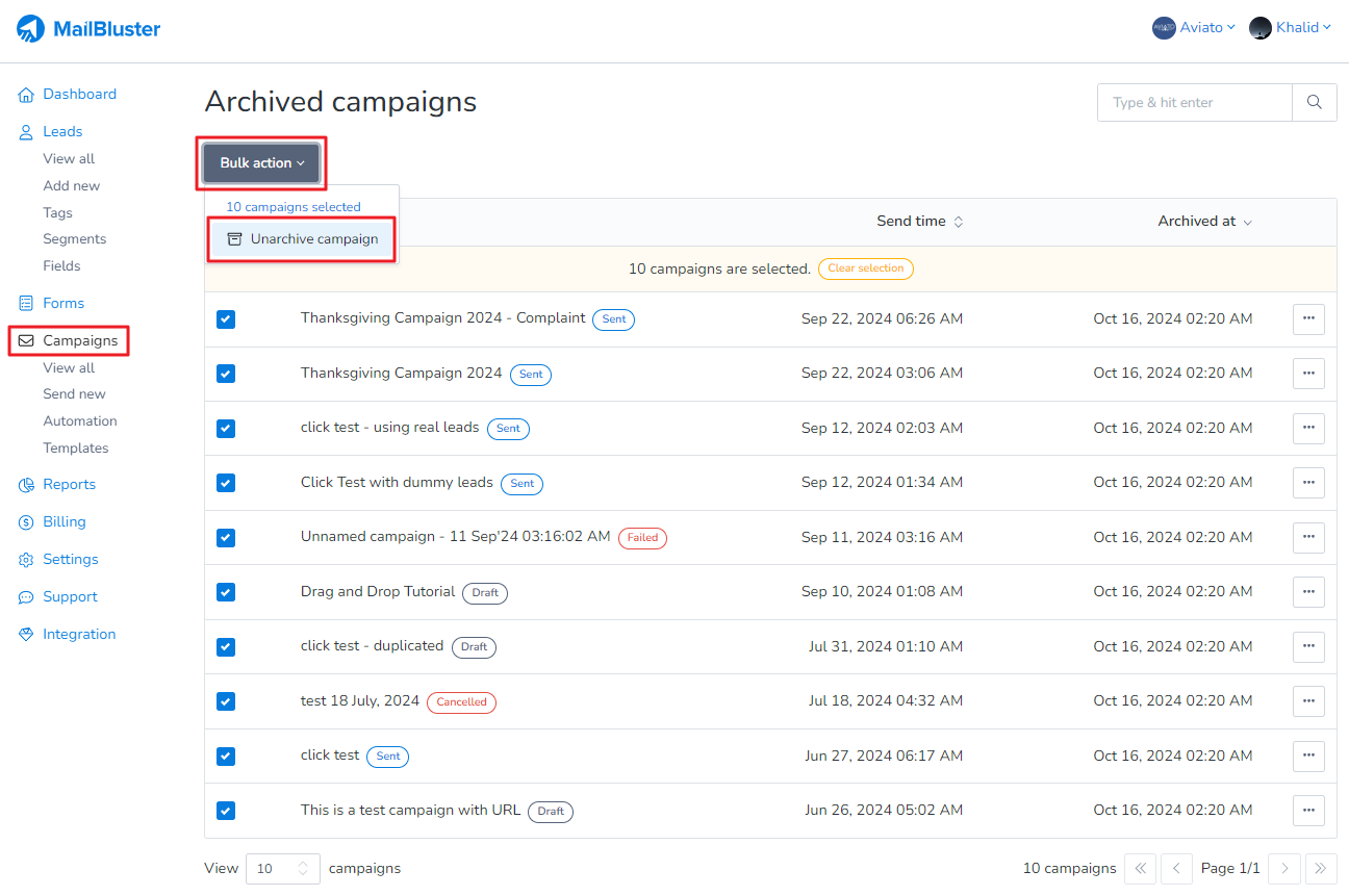 Then click on Bulk action > Unarchive campaign. A notification stating ‘n number of campaigns unarchived’ will confirm the action. You will then find these campaigns restored to their respective order.”