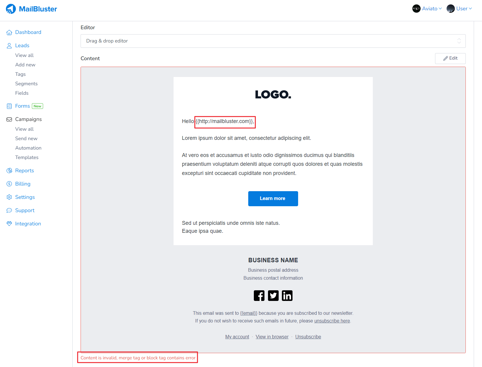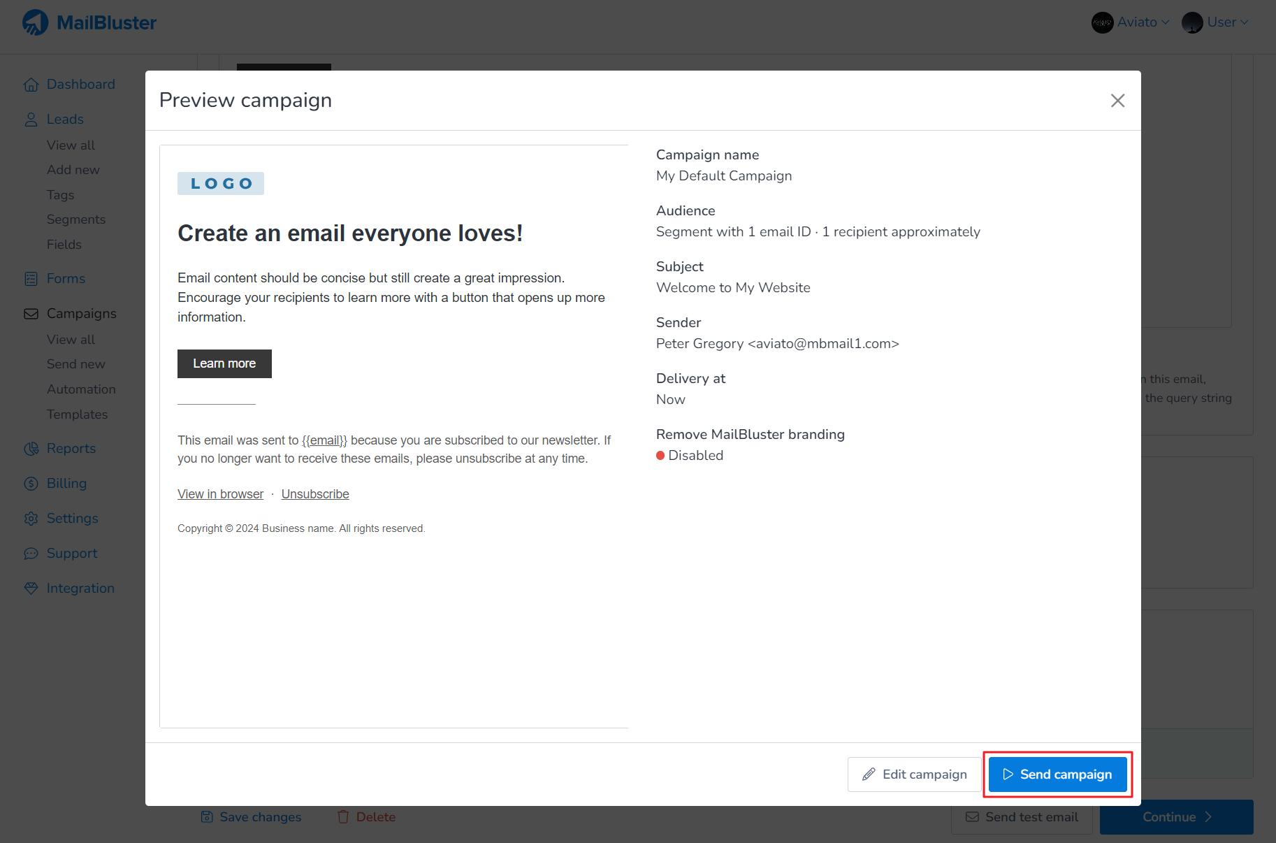 MailBluster branding is enabled by default for all the emails campaigns if you are using the Starter plan. Once you choose your Plan and add your Billing card, you will be able to remove the MailBluster branding from the email footer and unsubscribe page of your campaign email: