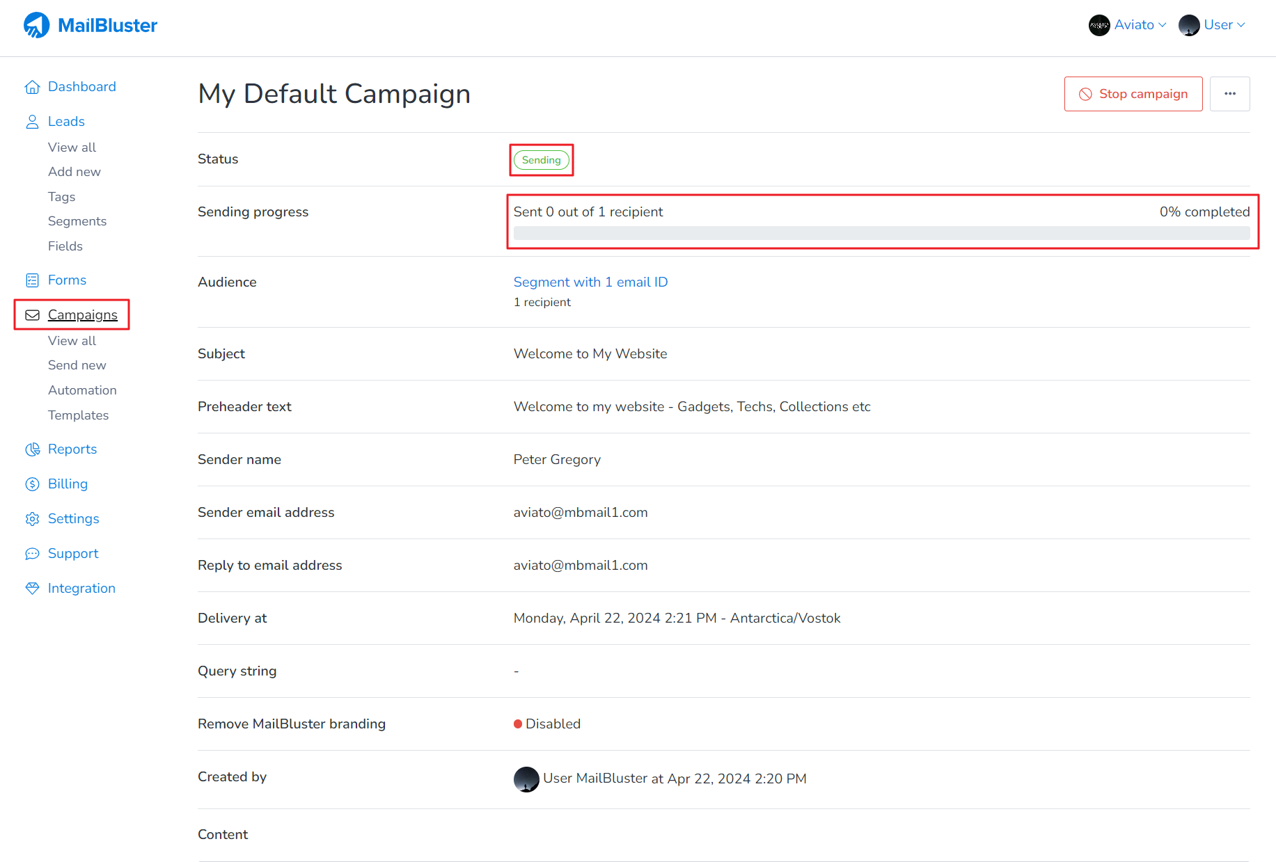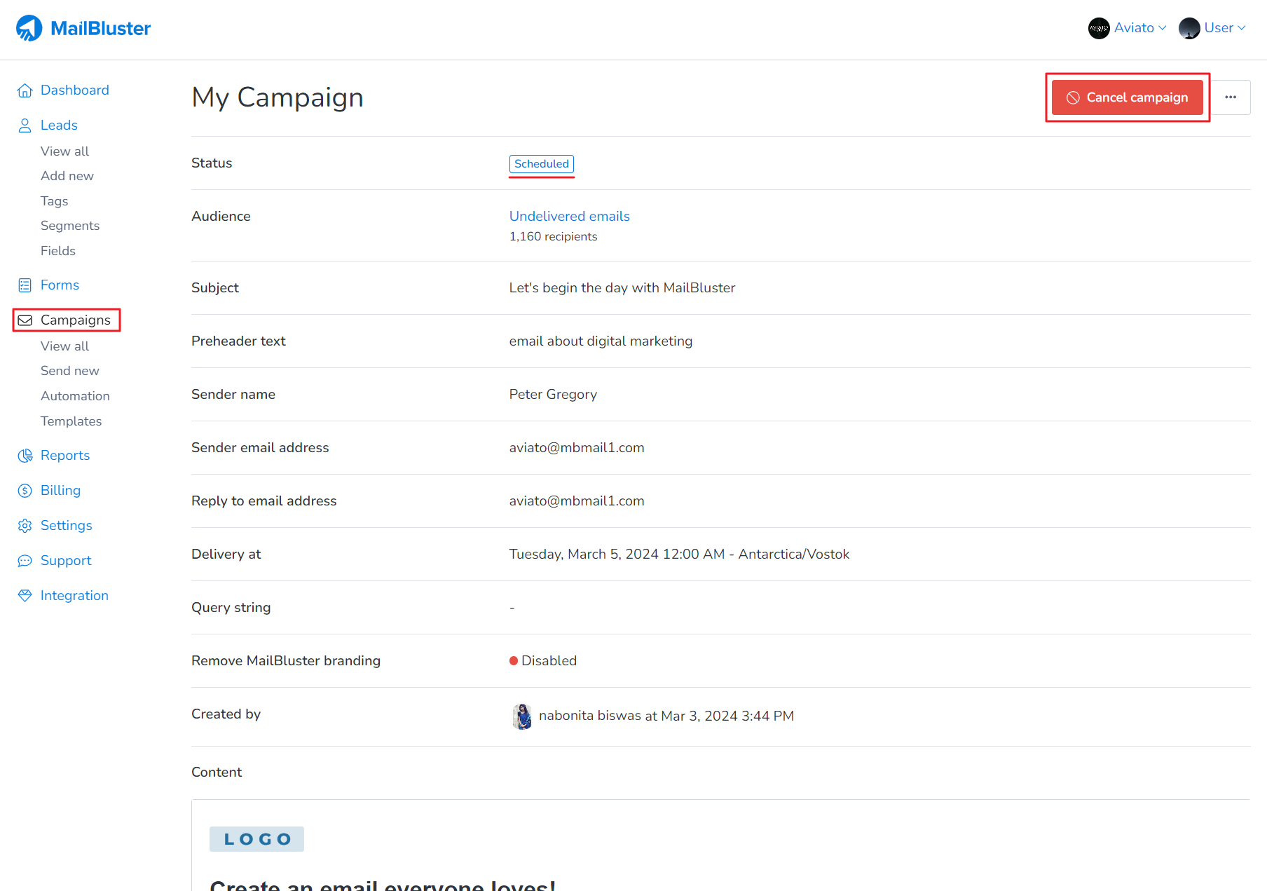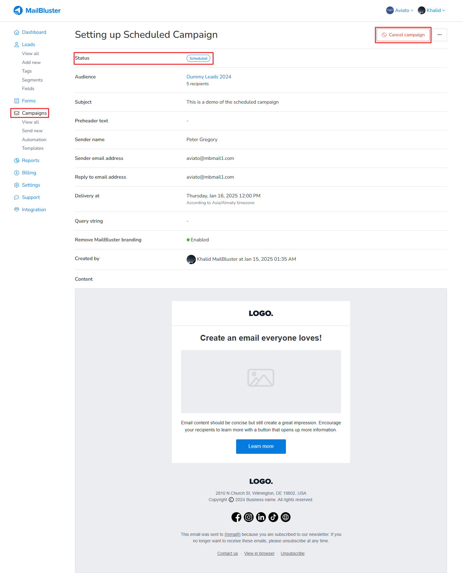 Once you are on the View campaign screen, you will notice that you campaign status is set to Scheduled. Just click on the Cancel campaign button.
