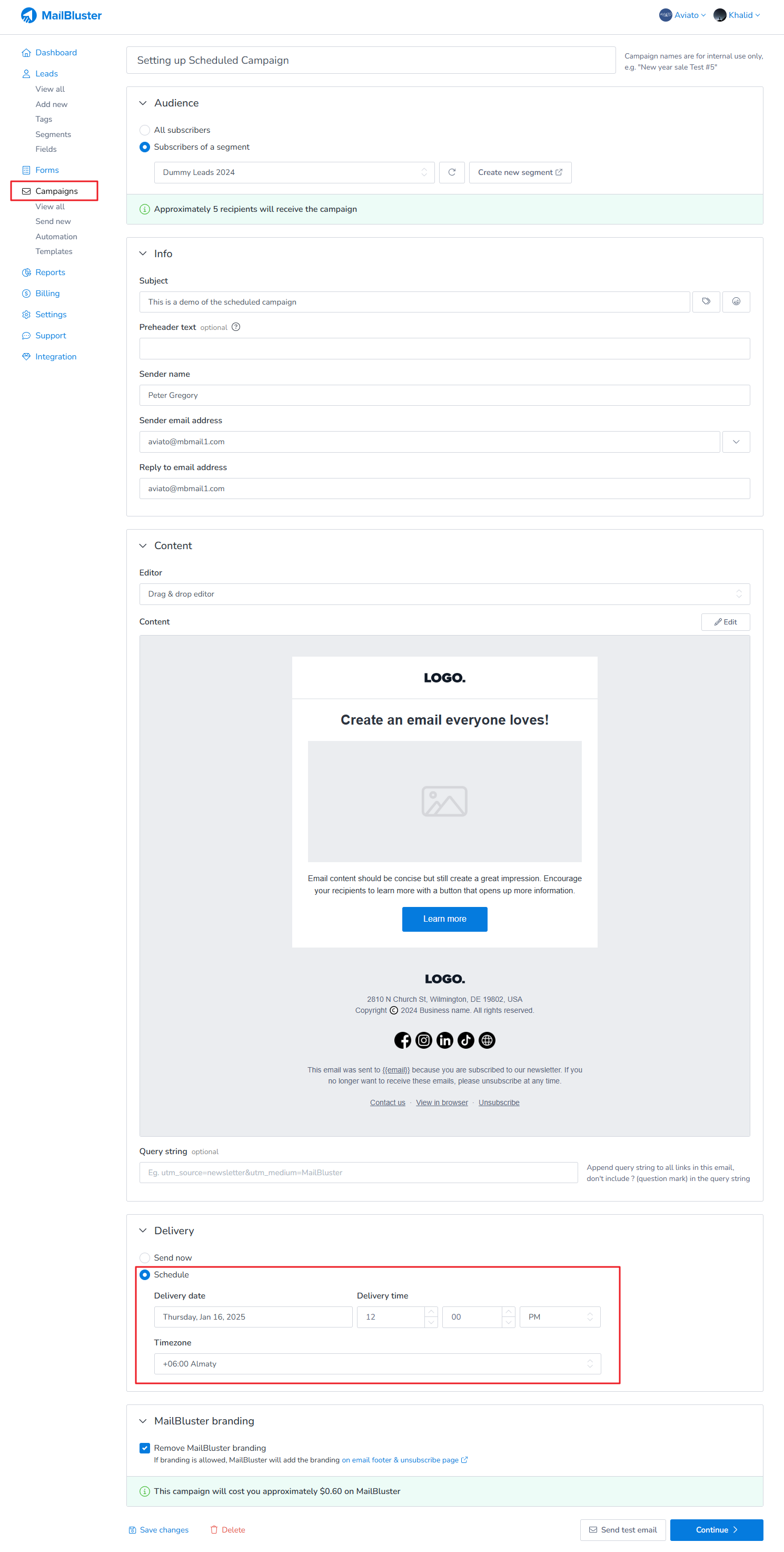 Now what you need to do is scroll down to the bottom of your campaign page and look for the Delivery section, where you need to select the Schedule option and enter your preferred Delivery date, Deliverytime, and timezone. Then click Continue to proceed.