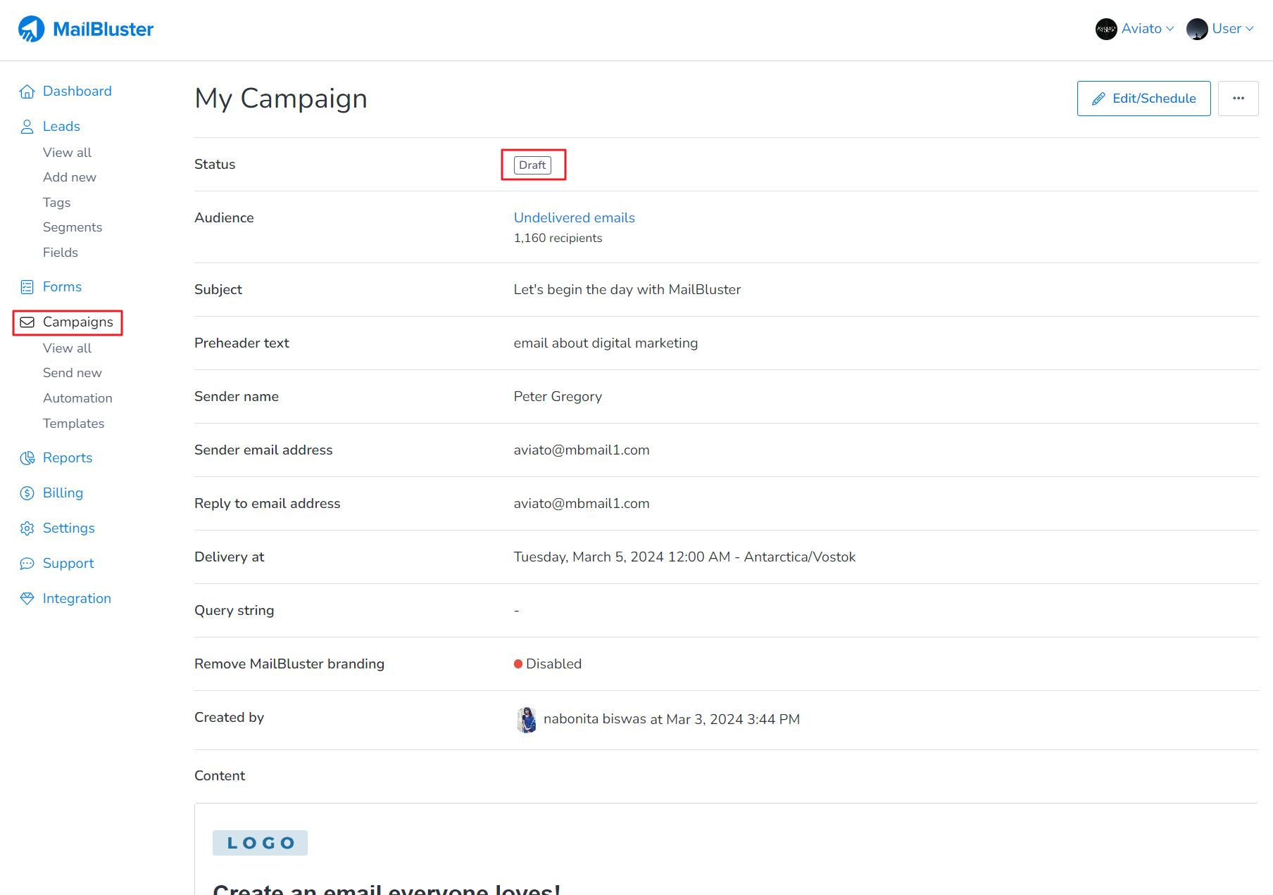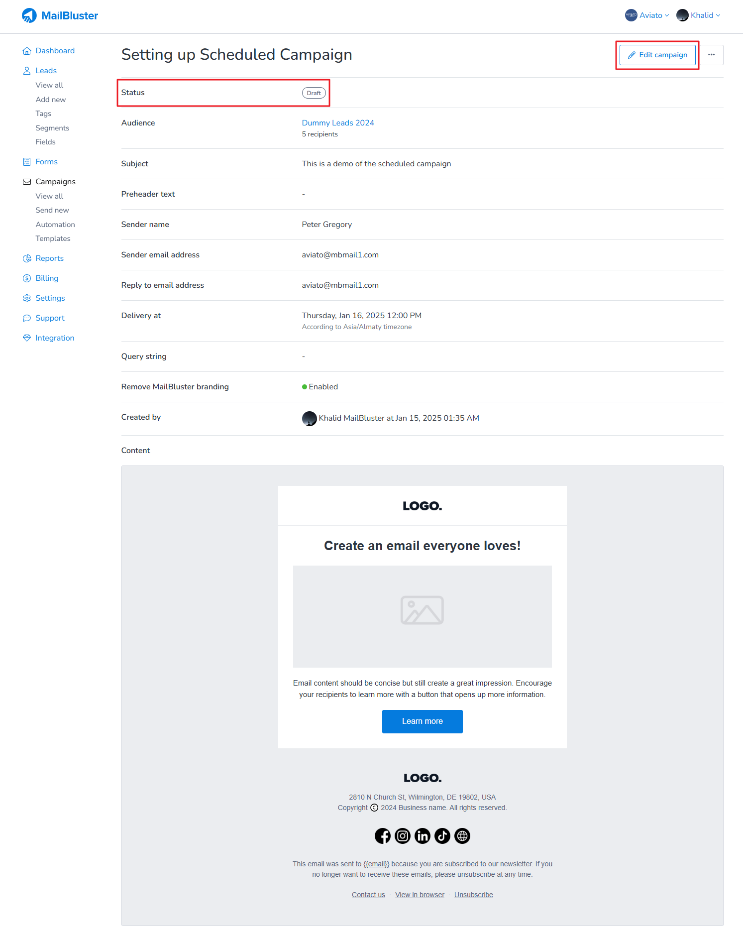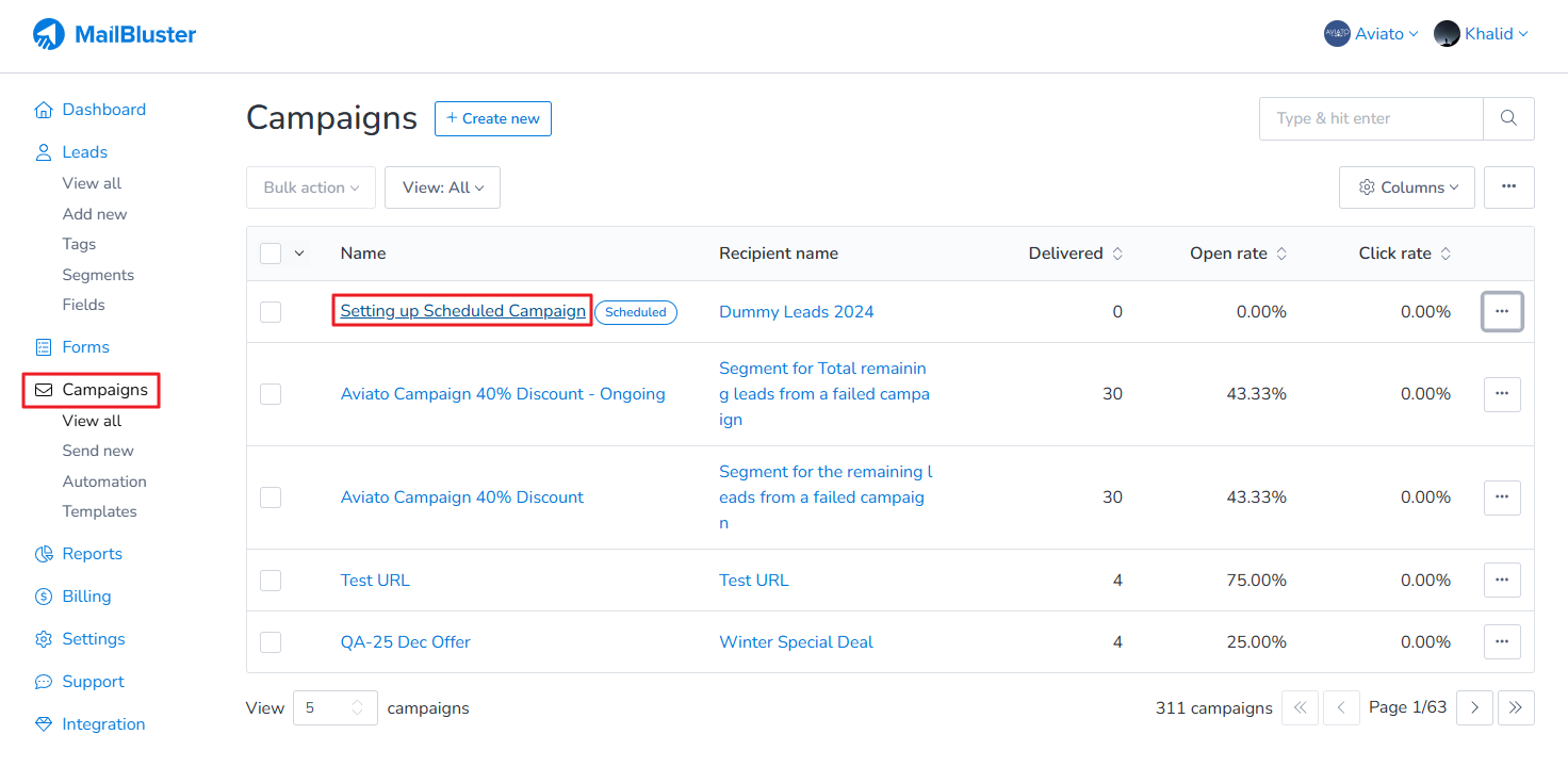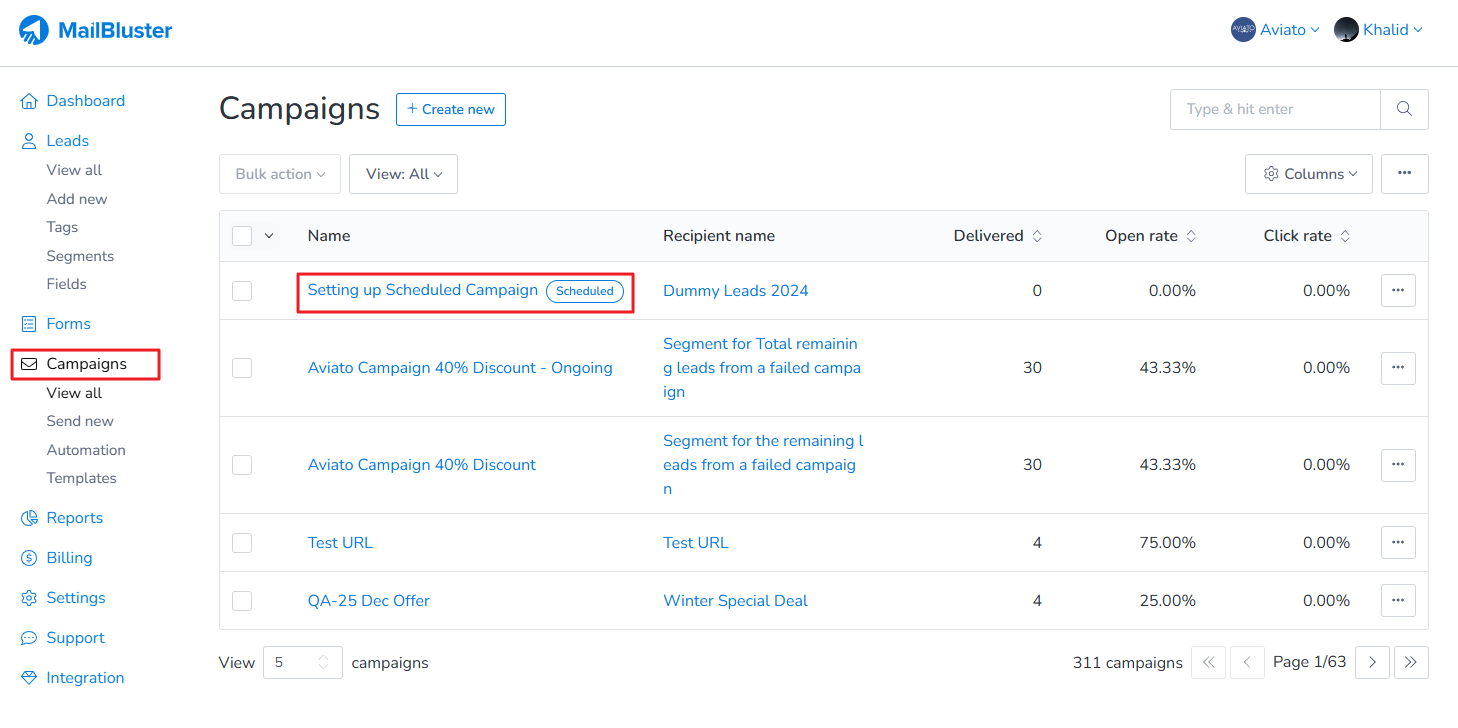 It will be marked as ‘Scheduled‘ in the Campaigns section as shown below.