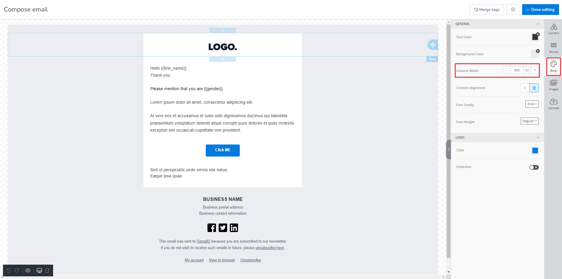 If you want to change the width of your email campaign, then open the campaign first. Then edit the campaign using Drag and drop Editor. Inside the Compose email, Go to Compose email window > Content > Body> Content Width. Using this option, you can change the width of your email campaign. The following screenshot will let you clarify it further: