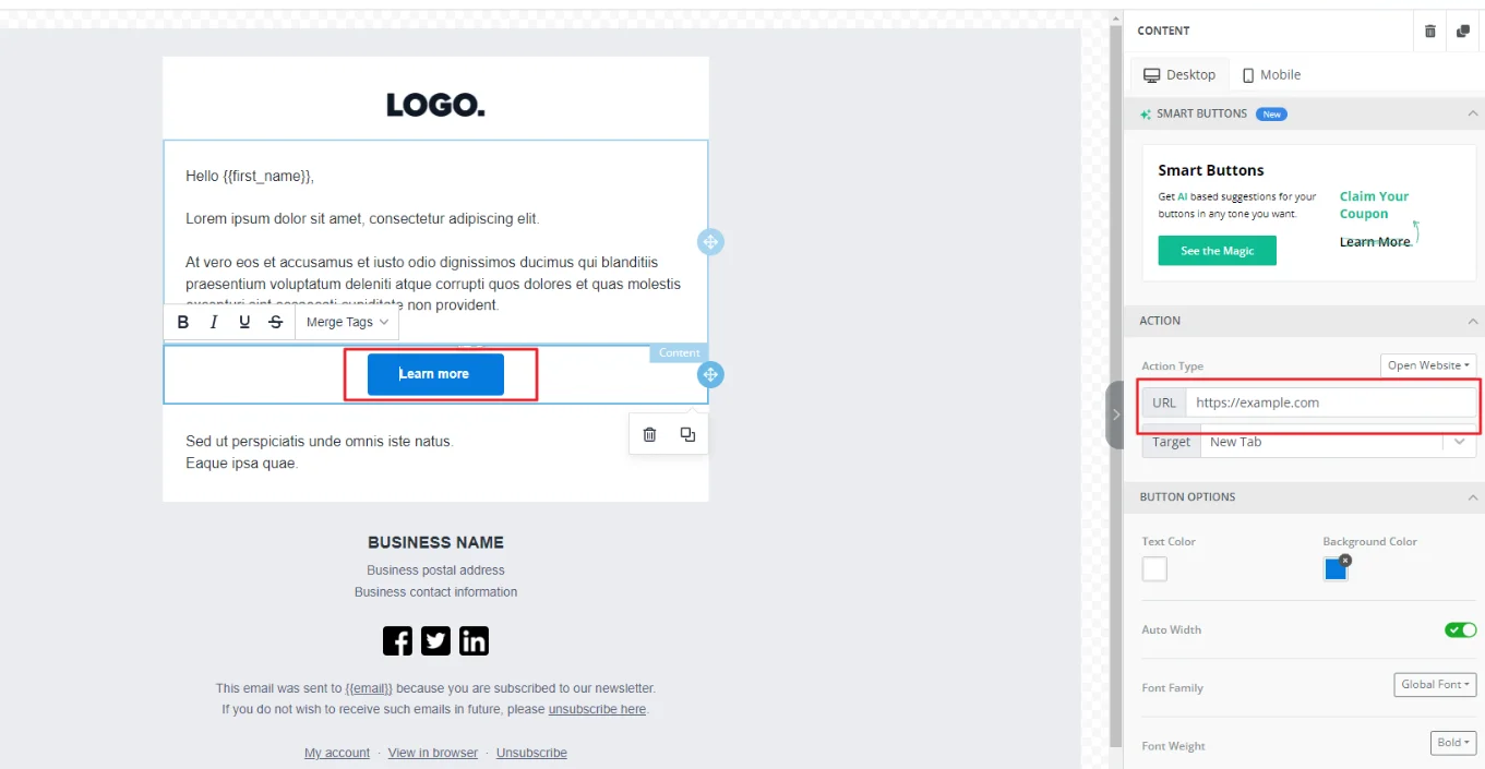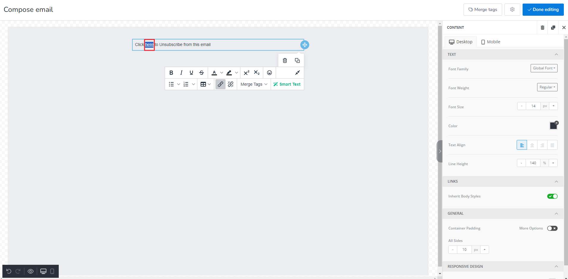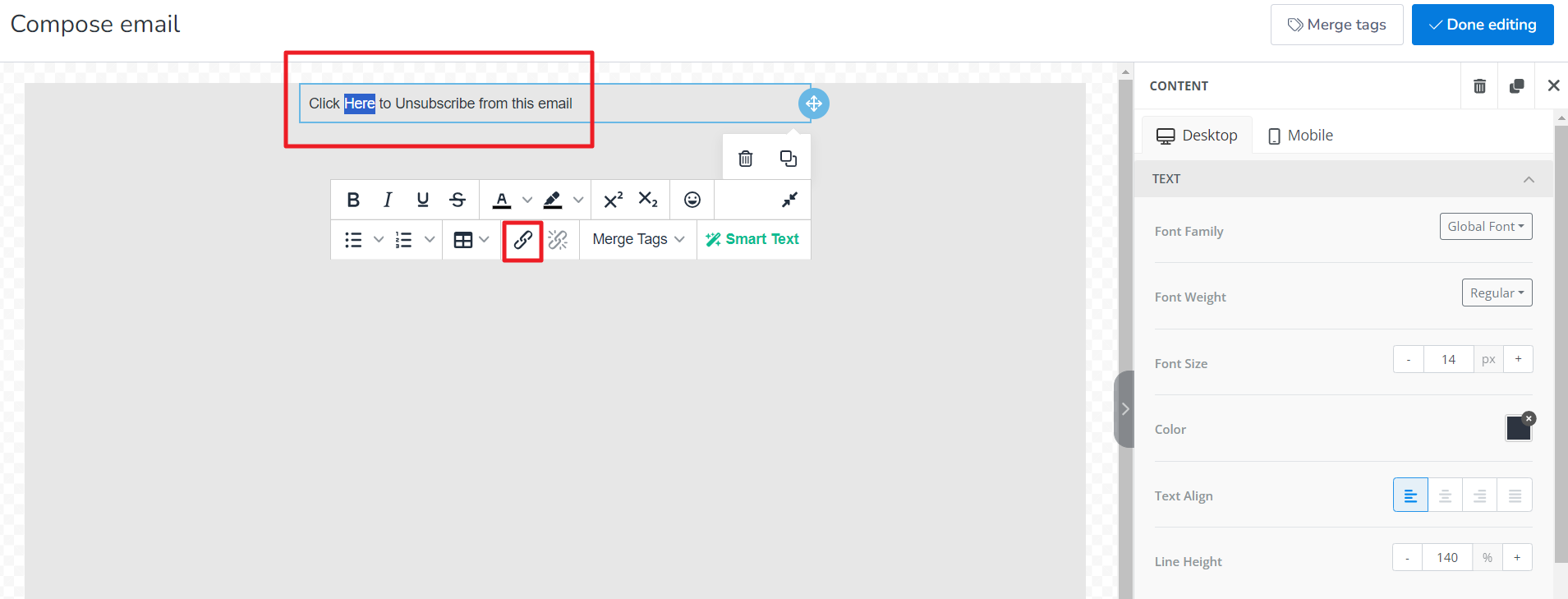 6. Now the unsubscribe link has been added to the highlighted text.