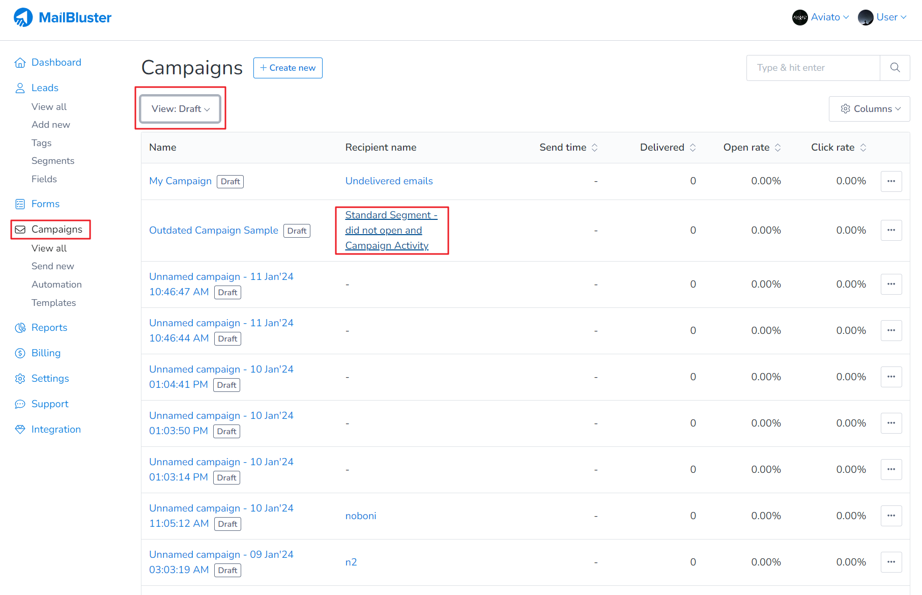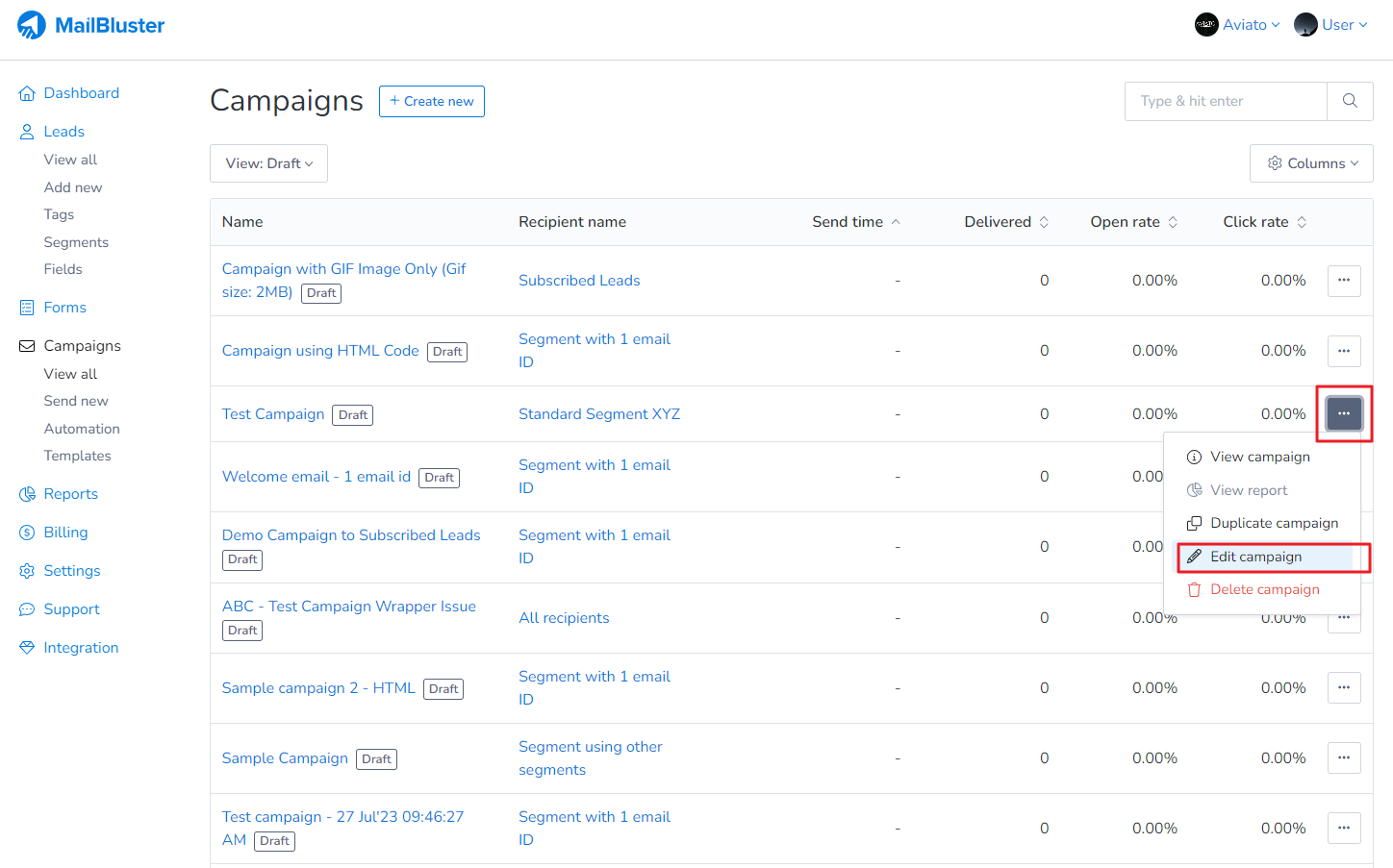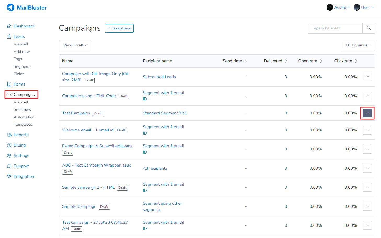 You can rename these type of campaigns Draft/Sent/Cancelled/Failed in MailBluster. First go to Campaigns. Then click on 3 dots (…) ellipsis. In the drop down list, click on Rename campaign.