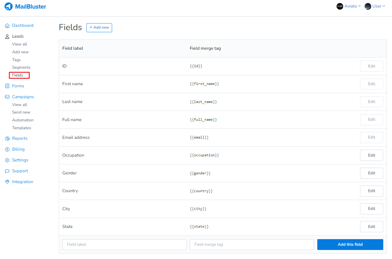 Or, select the predefined Fields from the list copying their merge tags