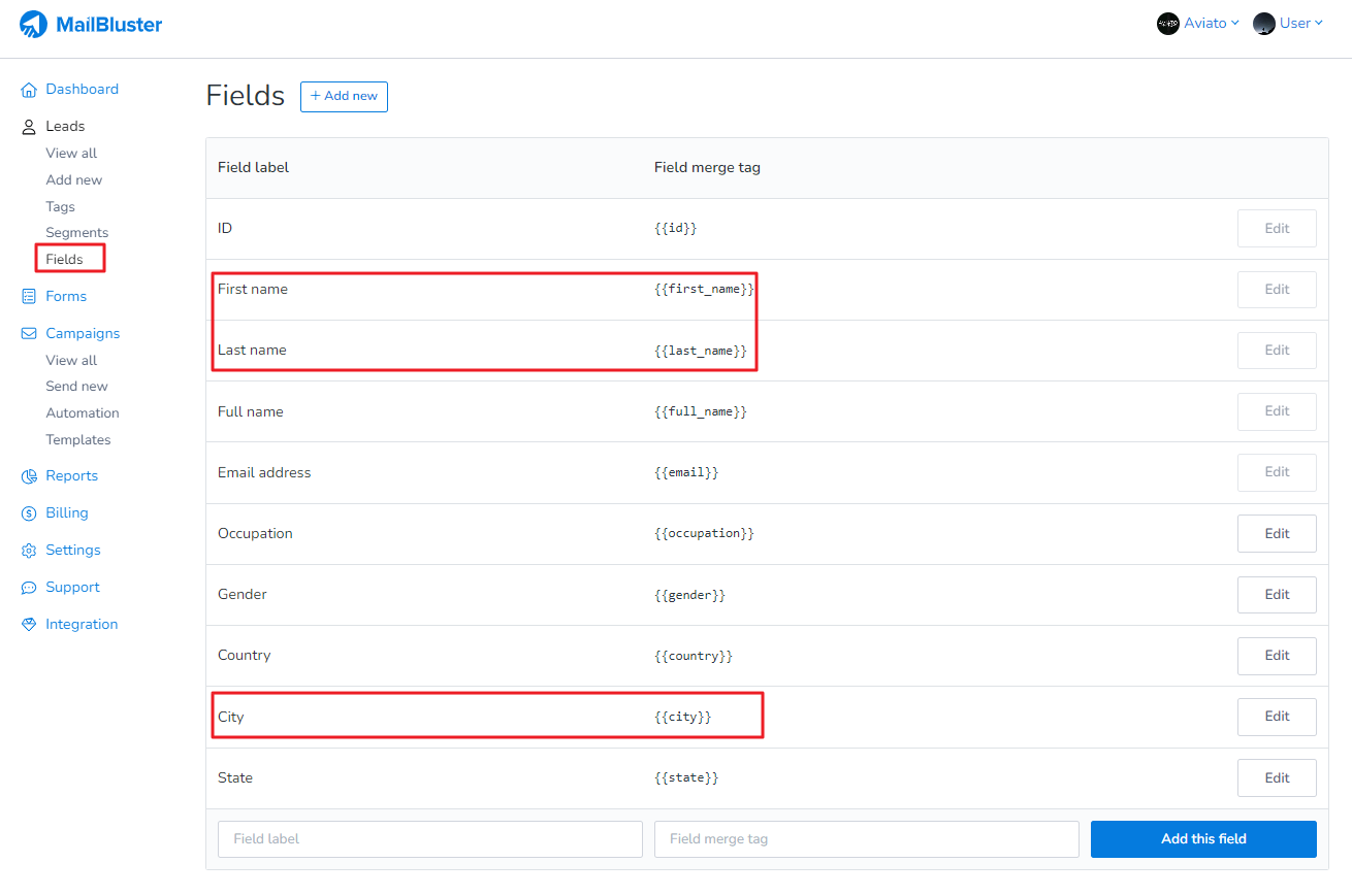 To personalize your email, first go to Fields then either select Add new > Add this field to define your desired custom Fields