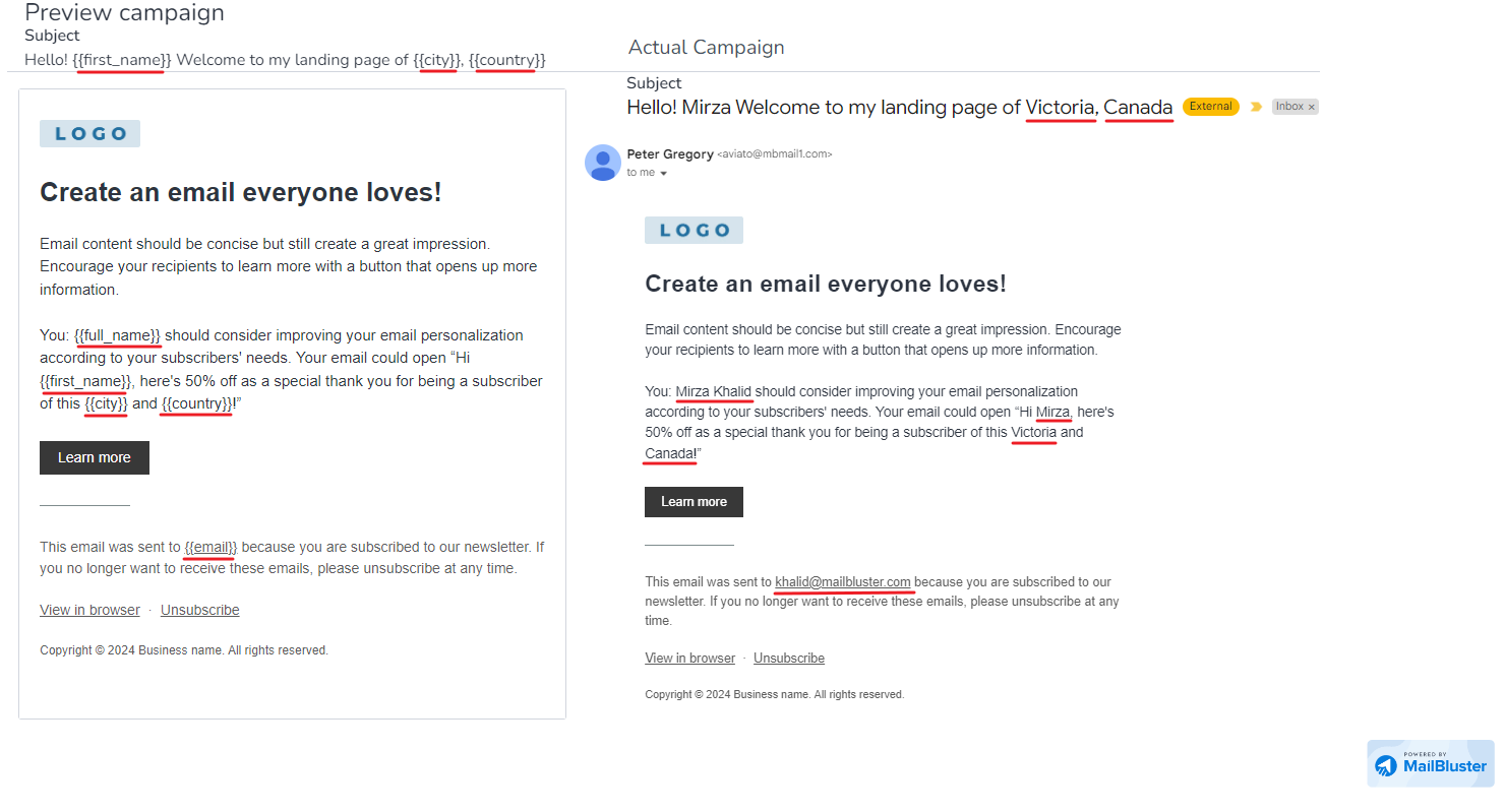 Once you completed personalizing your Email content, click Done editing and your marketing email is ready for send out. Here is an example of Personalized email side by side. The left one is before sending and the right one is after subscriber receives the personalized email.
