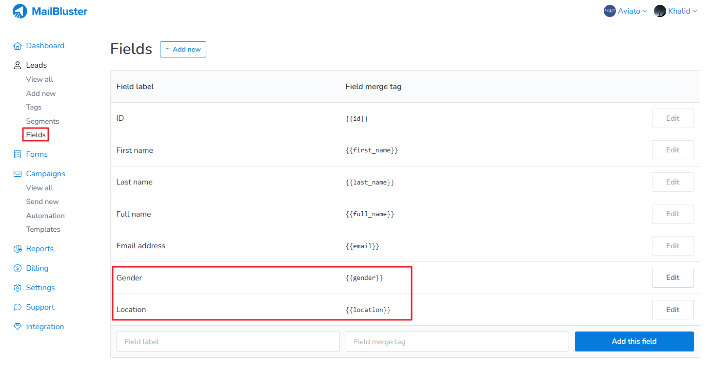 To send test email using merge tags from your Brand, first go to Fields. Then create two custom merge tags as shown below.