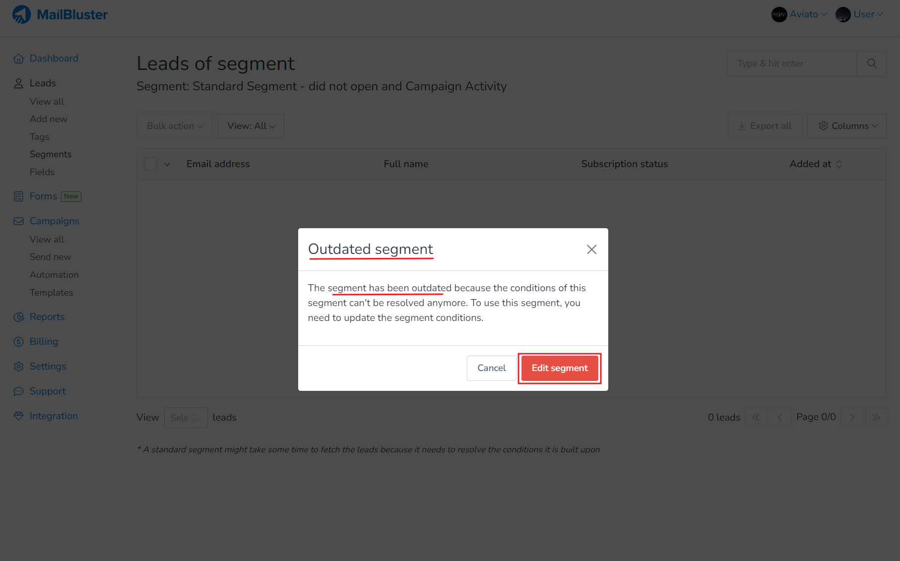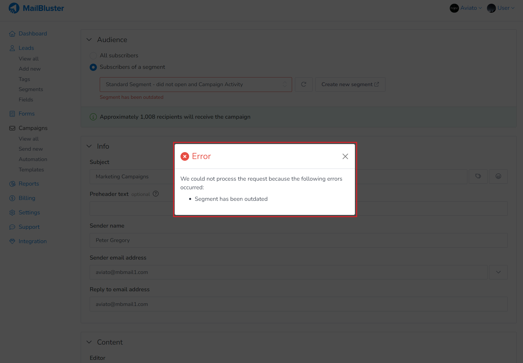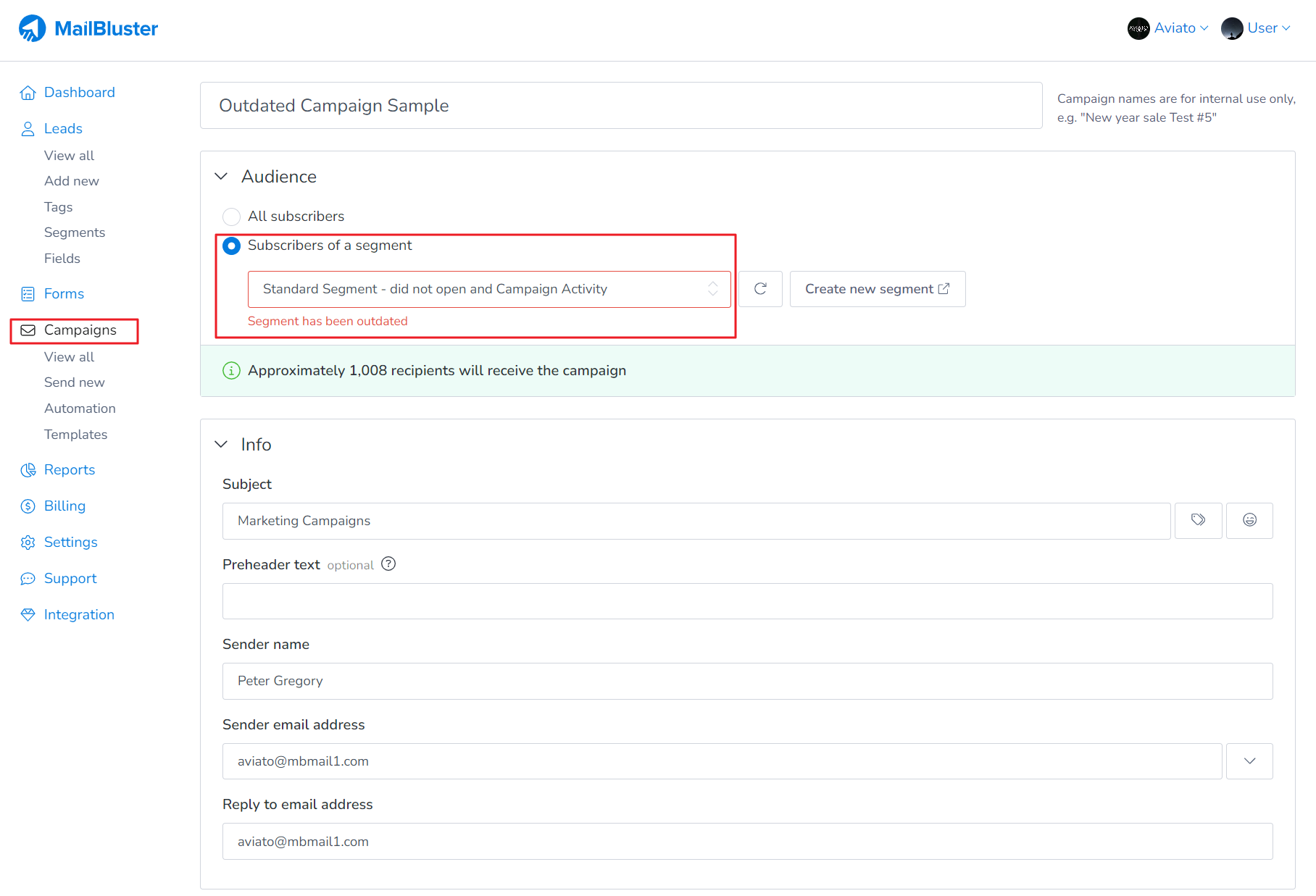 This error occurs because the segment you are using is outdated. This means the segment you selected is using conditions such as leads with campaign activity older than 1 year. MailBluster highlights this error, marking the selected segment in red and showing ‘Segment has been outdated‘.