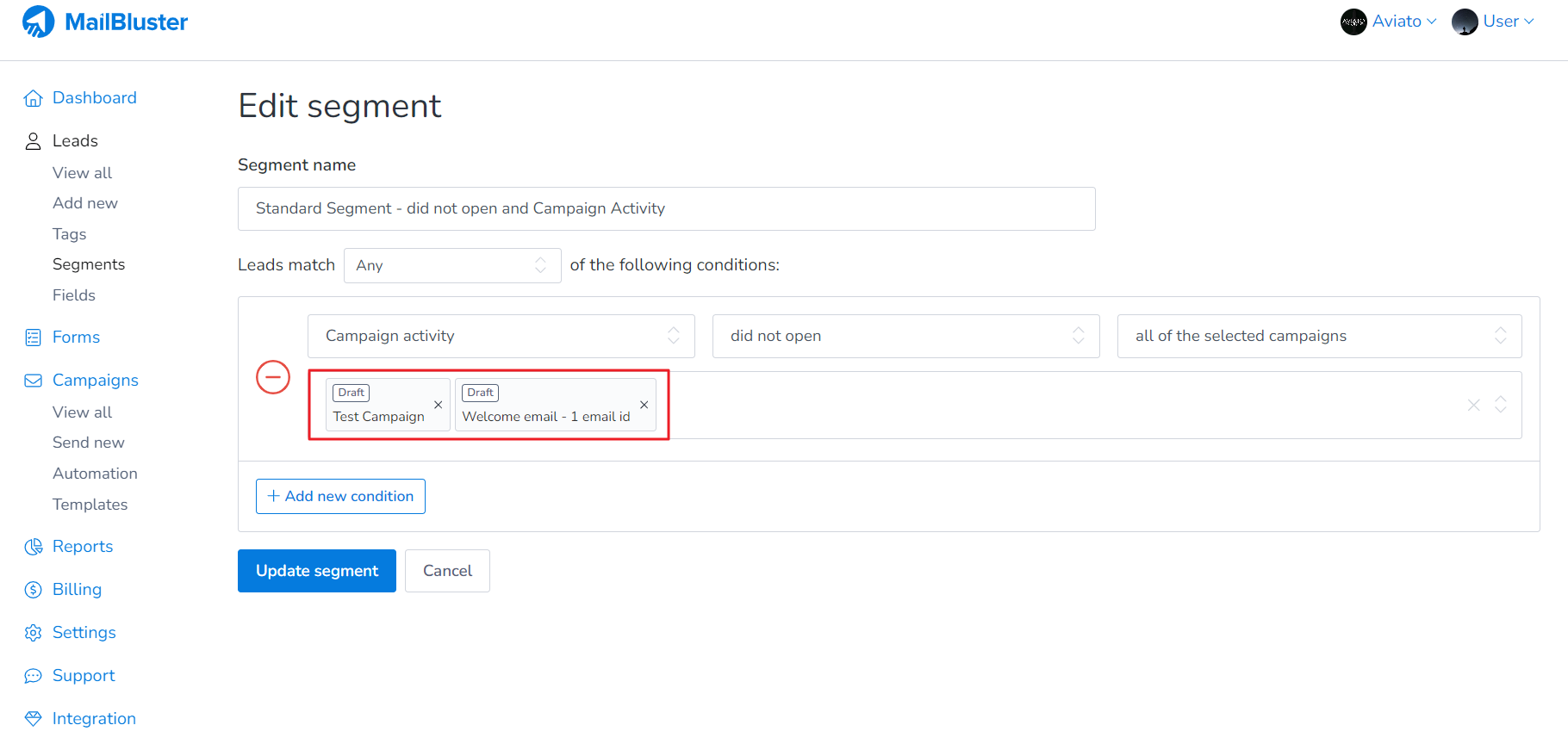After clicking on ‘Edit Segment,’ you will notice that the campaigns selected for this segment’s conditions (in this case, ‘Campaign activity: did not open‘) are more than 12 months old. Keep in mind that you should avoid using campaigns or segments older than one year, as MailBluster now retains campaign activities for only the past 12 months.