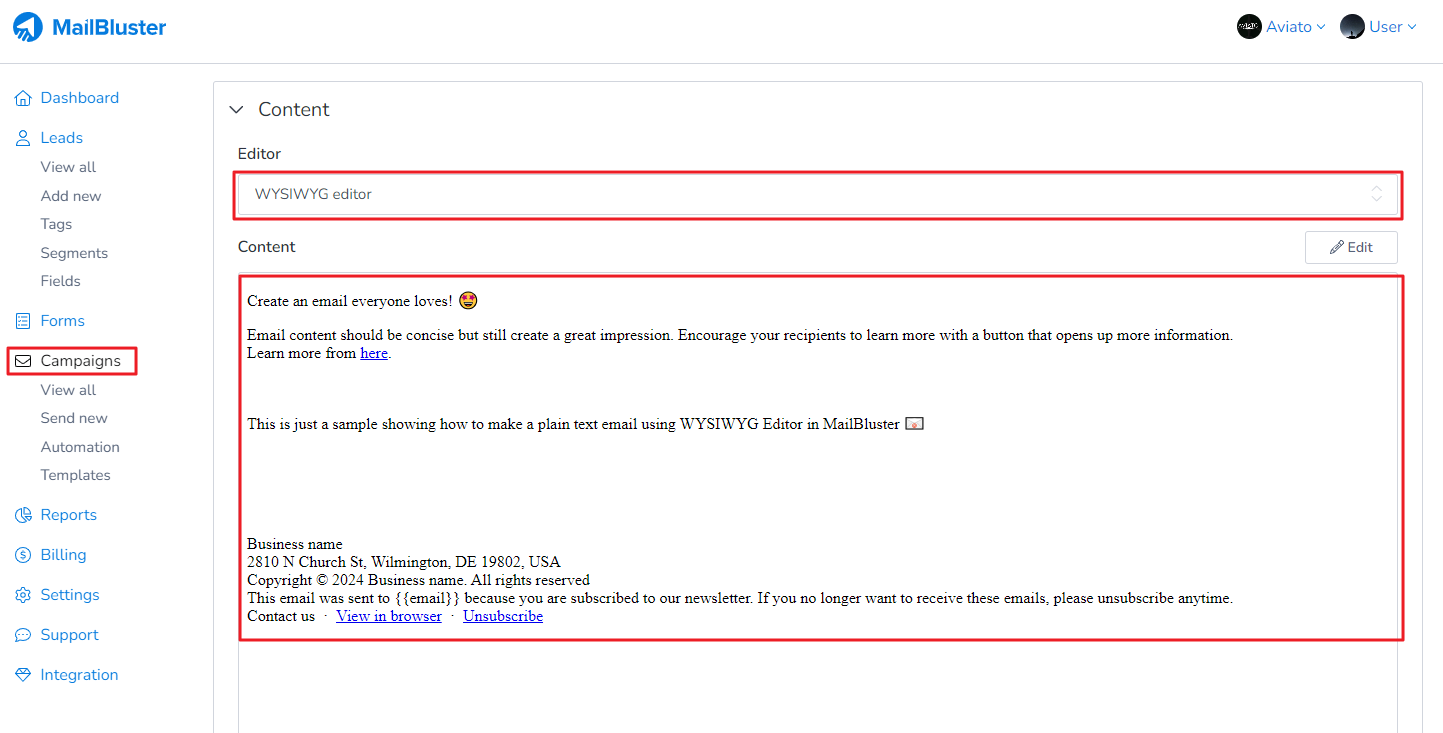 You can send plain text using MailBluster if you use the WYSIWYG editor. Plain text with emojis are also possible to send using this editor present in MailBluster.
