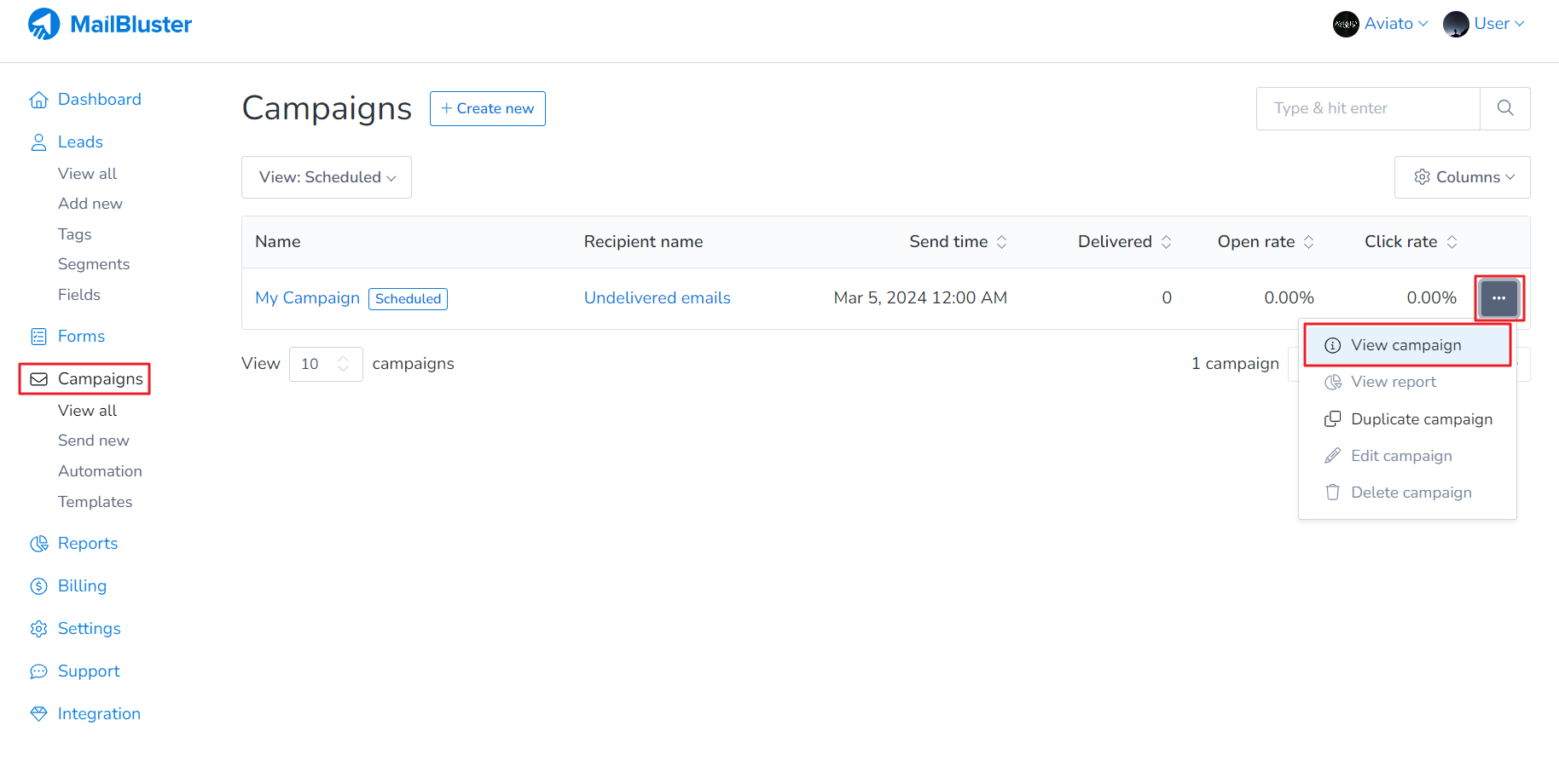 To cancel a schedule campaign, first make sure that your campaign is in Scheduled state as shown below. Click on the 3 dot ellipsis. Then click on View campaign.