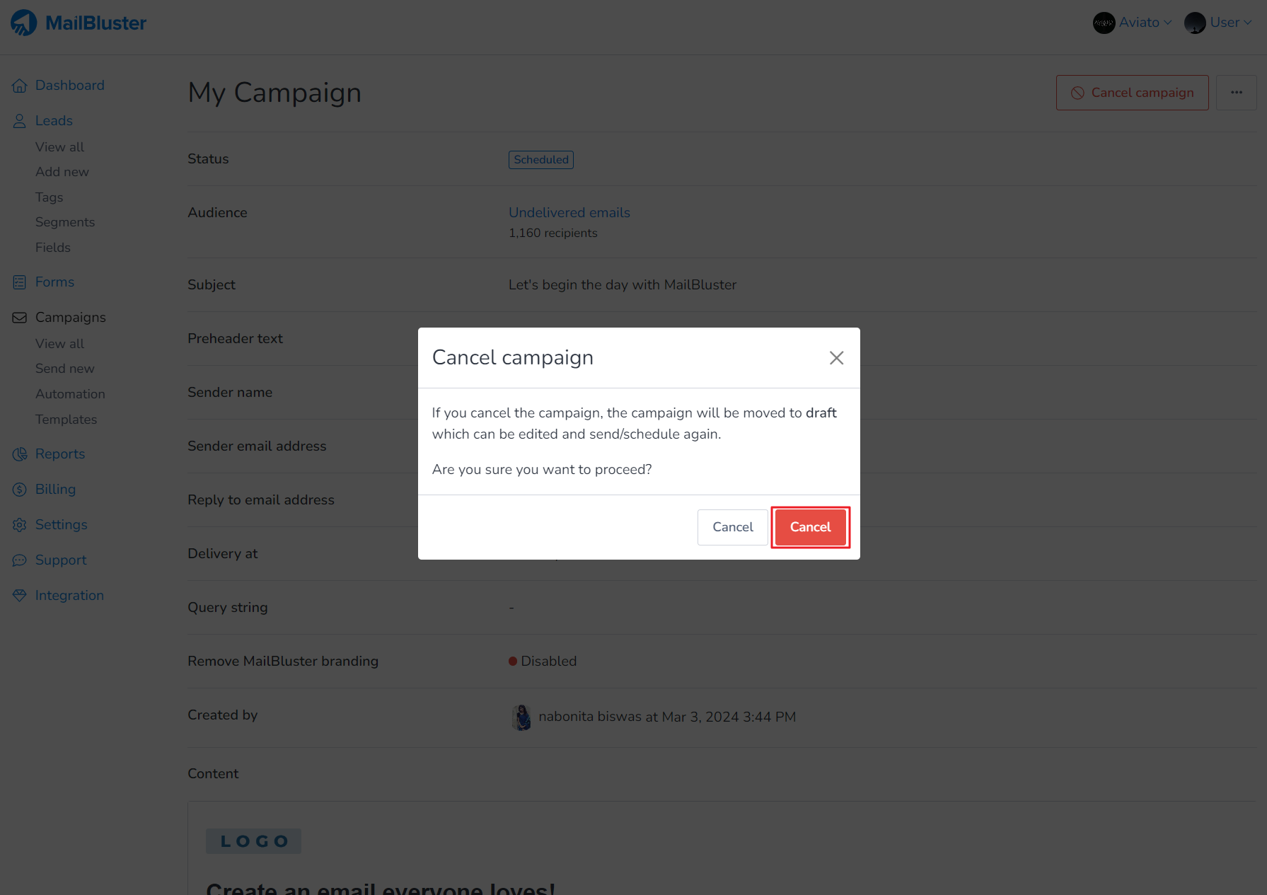 A confirmation dialogue box named Cancel campaign appears. Click on Cancel button.
