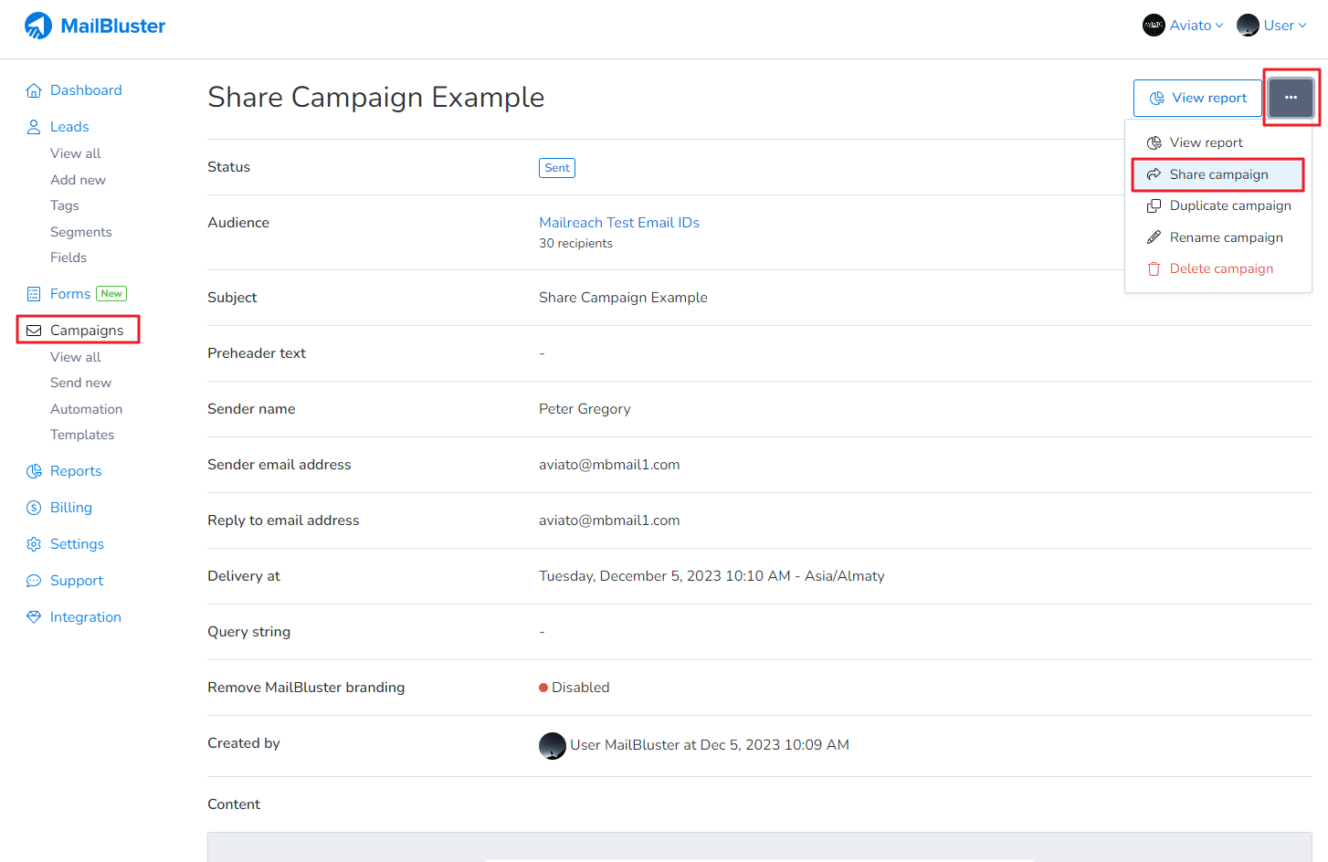 When the sent campaign is shown, click on the 3 dots beside View Report and a dropdown list option will appear. Click on Share campaign.