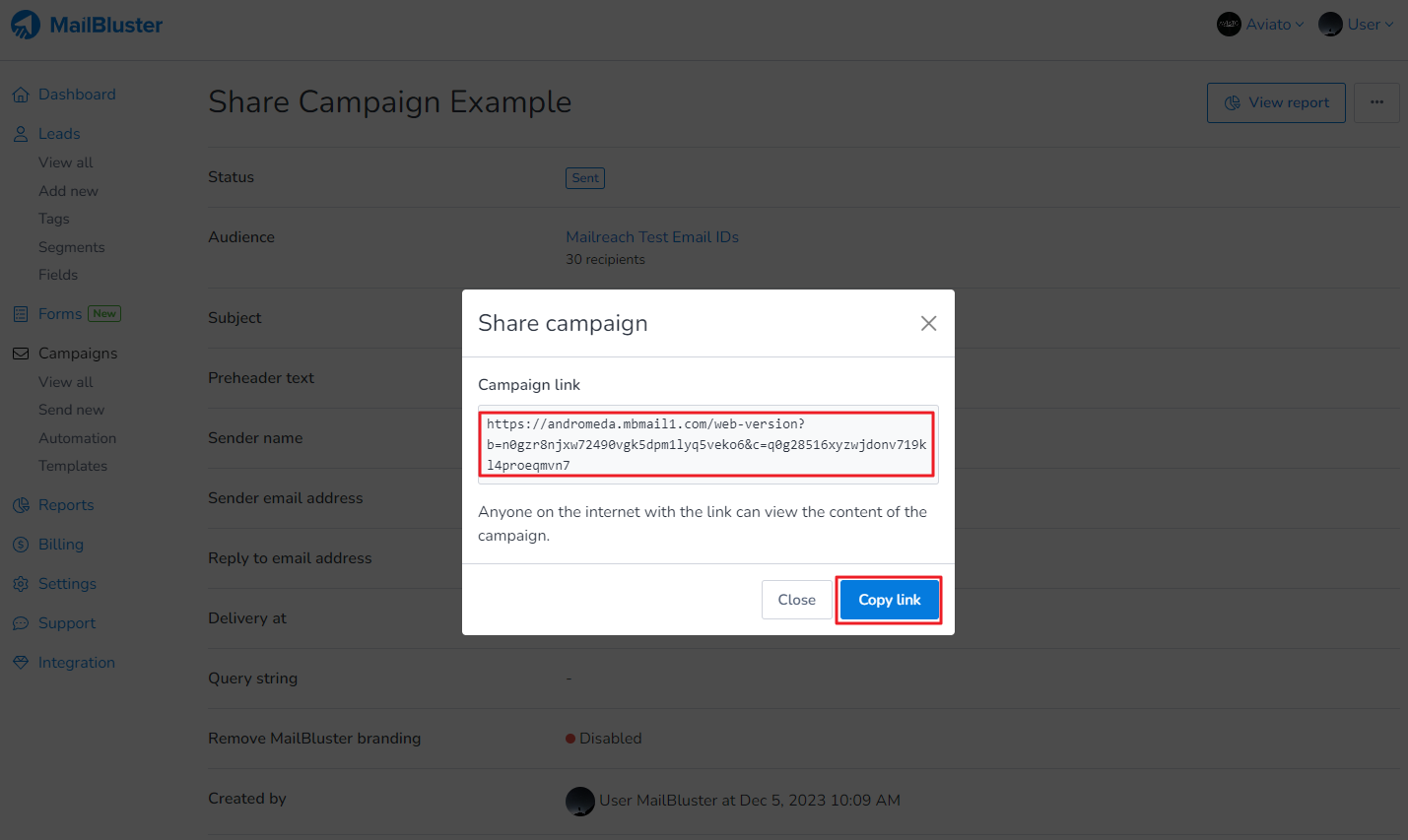 Now, you can share the entire sent campaign with anyone using this generated link from MailBluster.