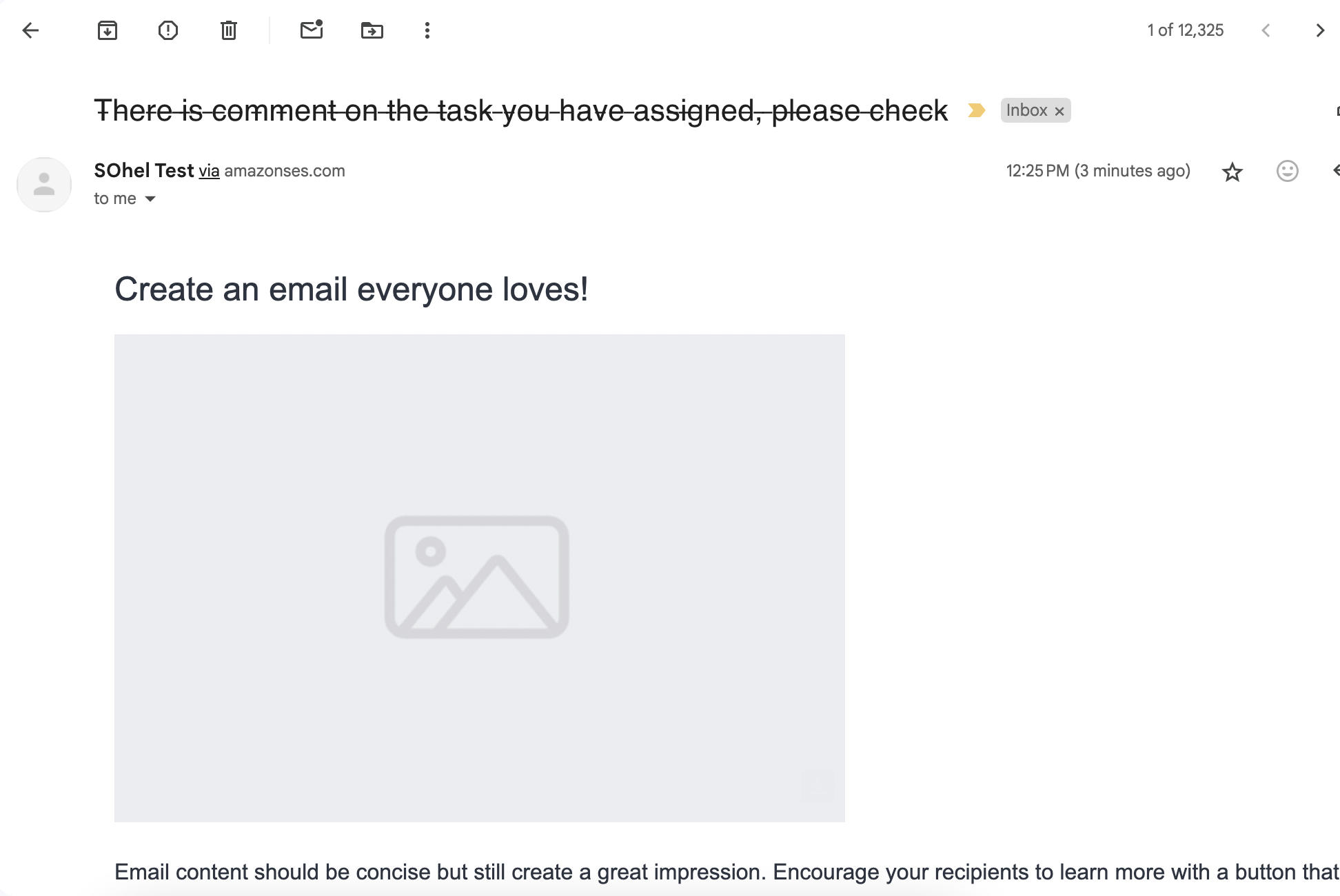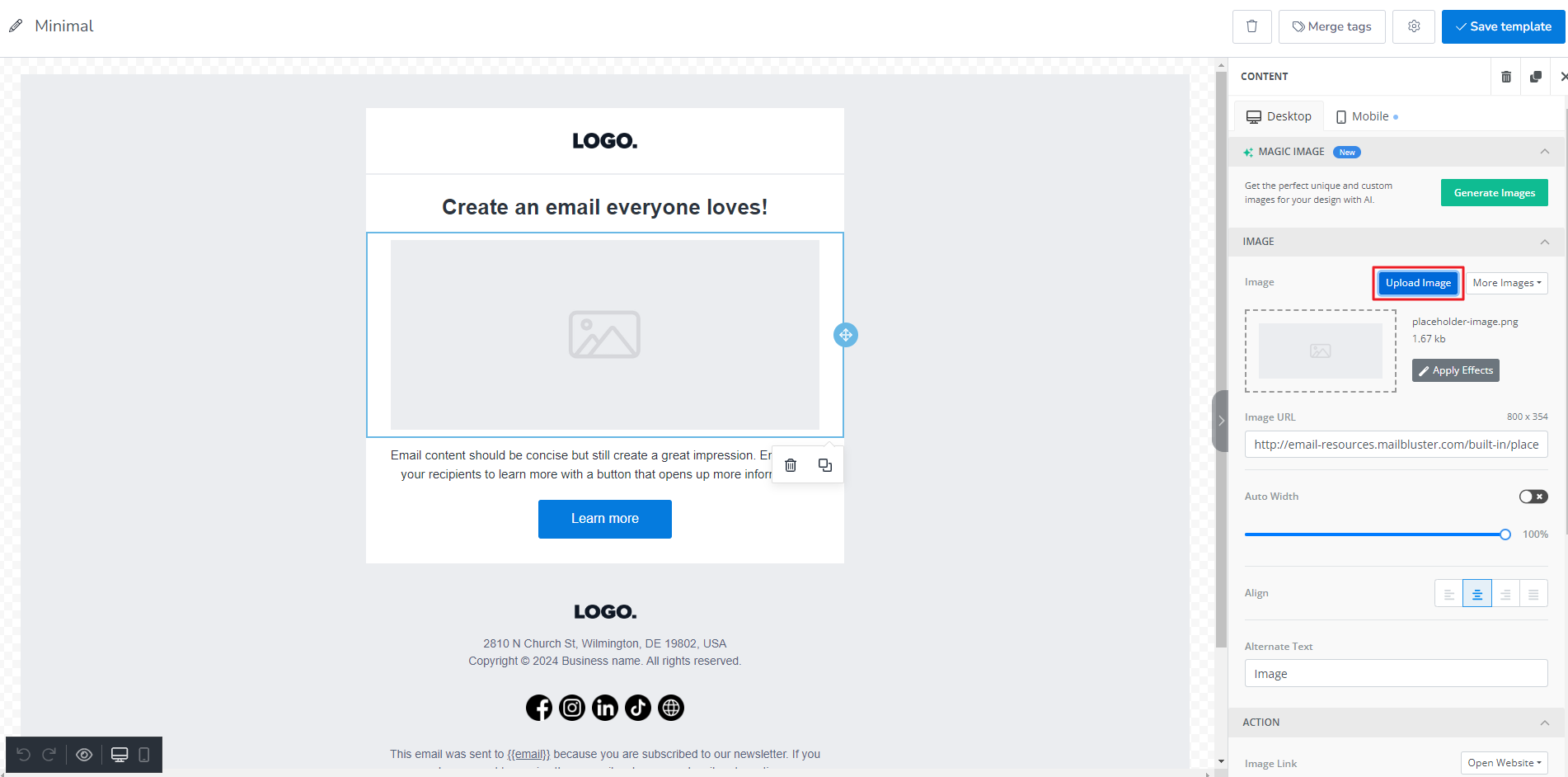 Click on the Image placeholder, and an Upload image button will appear on the right side of Content section. Either drag and drop an image on the Drop and upload placeholder or click on the Upload image button and upload your desired image on the composed email.