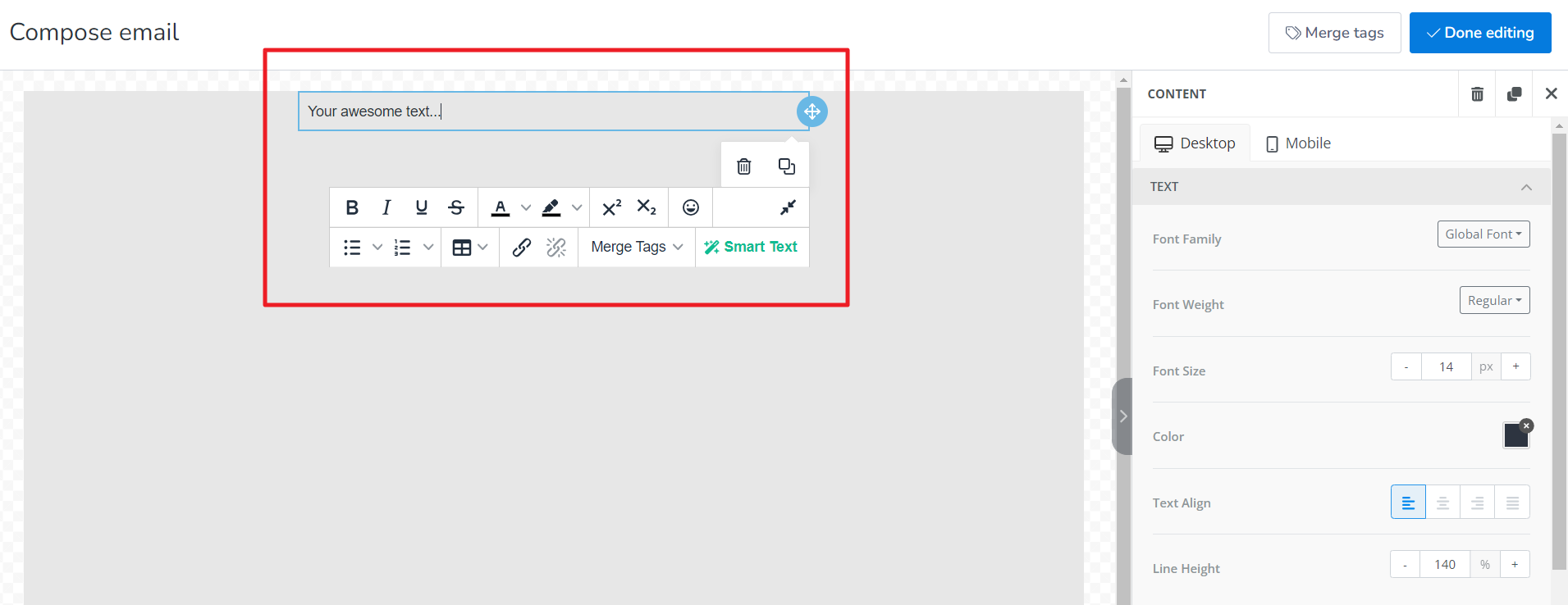 1. On the right corner select the Content section, click TEXT box and drag and drop on the compose email area.