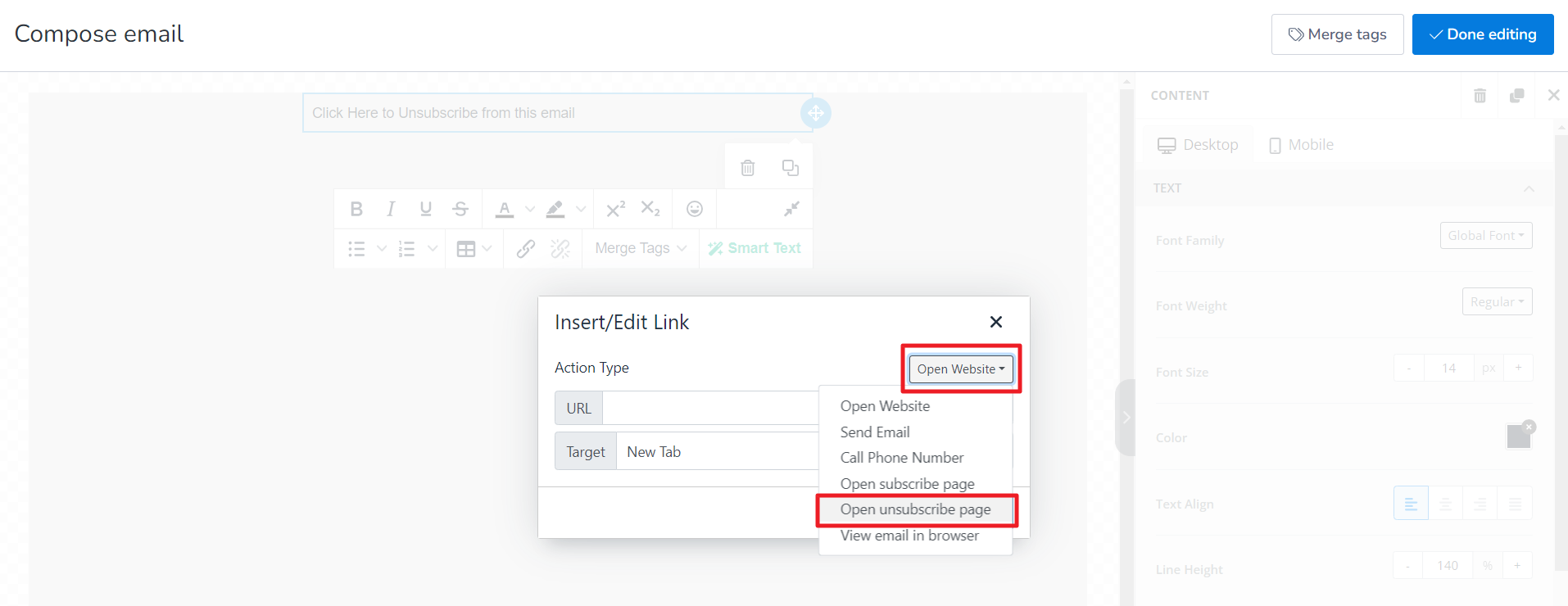 Once the editor opens, select any text and the highlight it. Once highlighted, click on Insert/Edit link and enter the merge tag “{{unsubscribe_url}}” in the URL field of the Insert/Edit Link popup box.