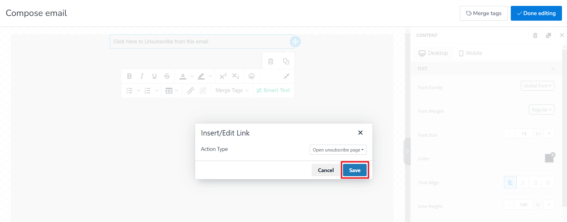 5. Click Save and the unsubscribe link is set on your email campaign.