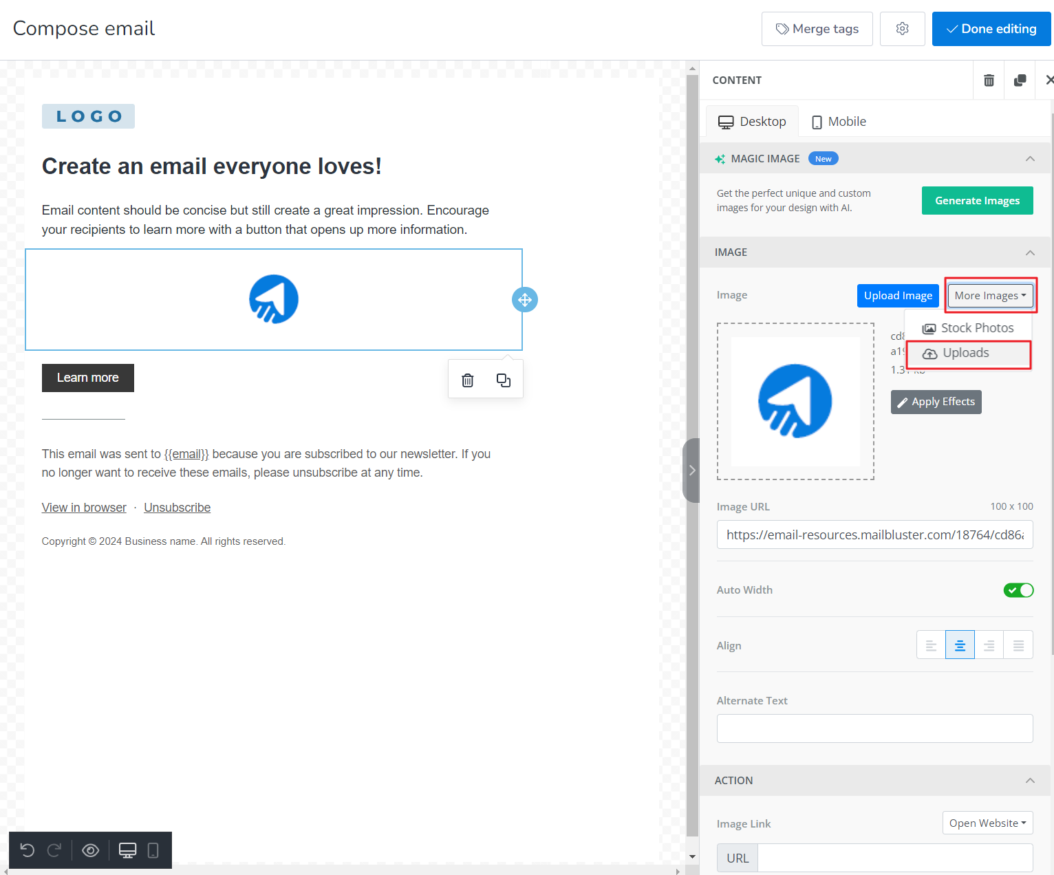 Or you can click on More Images and click Upload to upload more images in MailBluster.