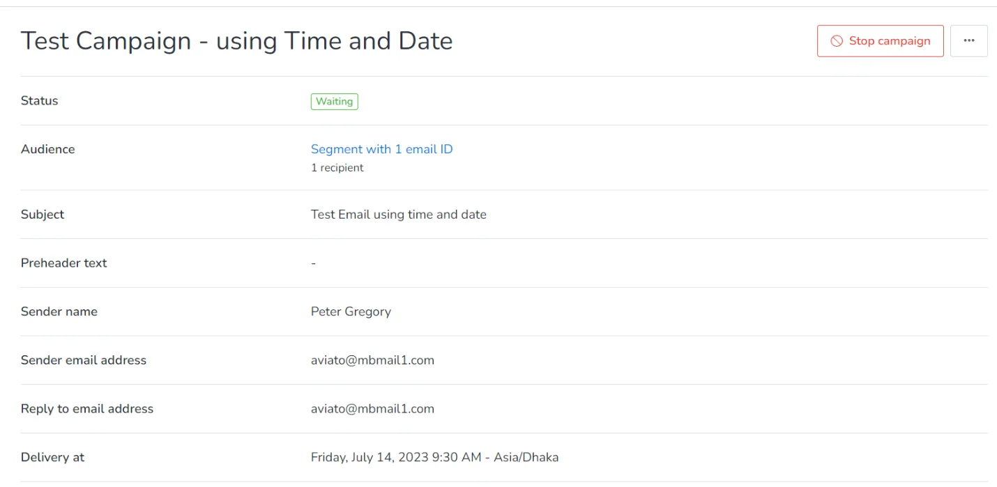 MailBluster tries to send the campaign within one minute of your exact scheduled time. During this minute, there is a buffering time in case the sender wants to cancel the campaign.