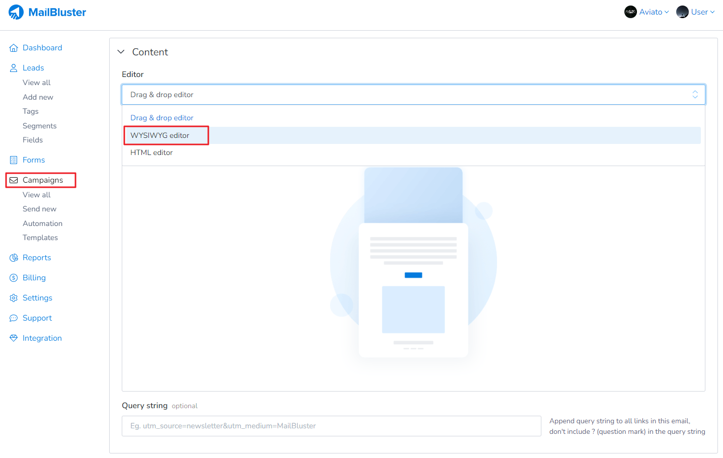 If you want to track your email campaigns using Google Analytics, you have to use the Query String option available in MailBluster campaign. You can optionally add query string to all of the links of your campaign body as well just before sending a campaign.