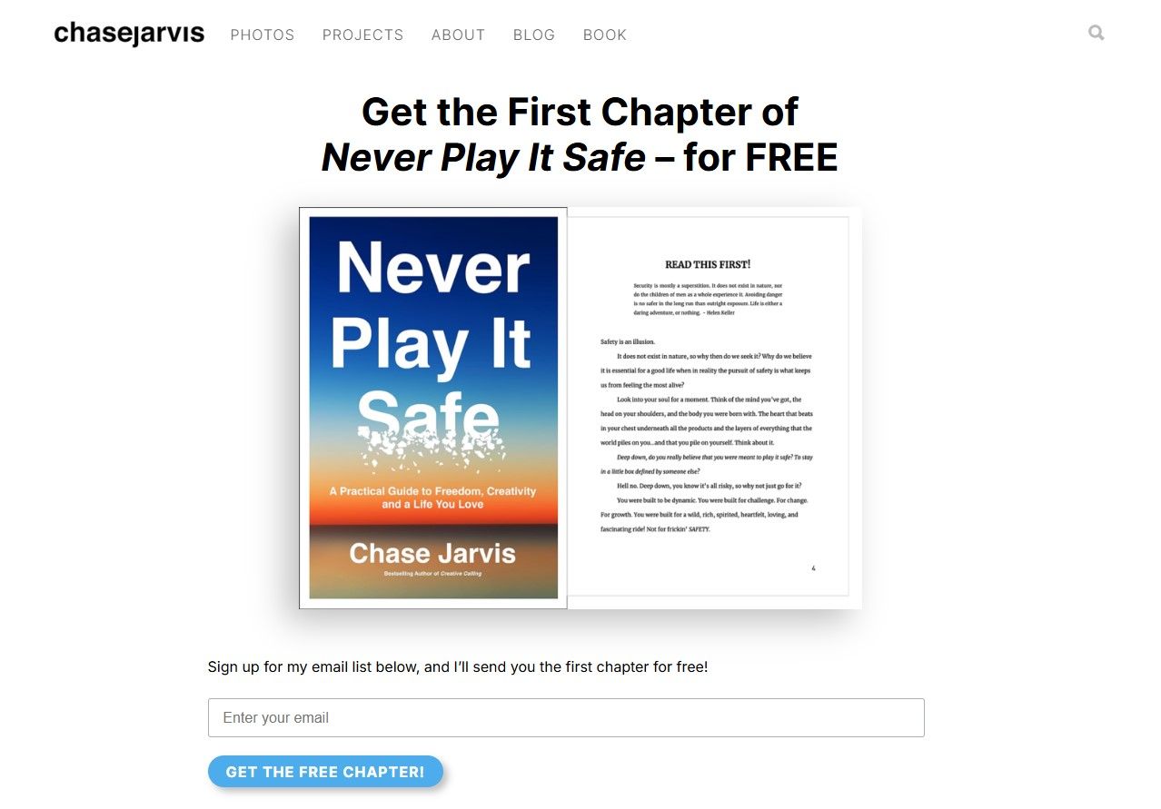 In the following picture from a photography business website, you’ll find both lead magnet and newsletter landing page examples. Using it, Chase Jarvis is effectively capturing leads. Also, he offers the first chapter of his book for free in exchange for email list or newsletter signups, which works as a lead magnet that surely attracts visitors to sign up.