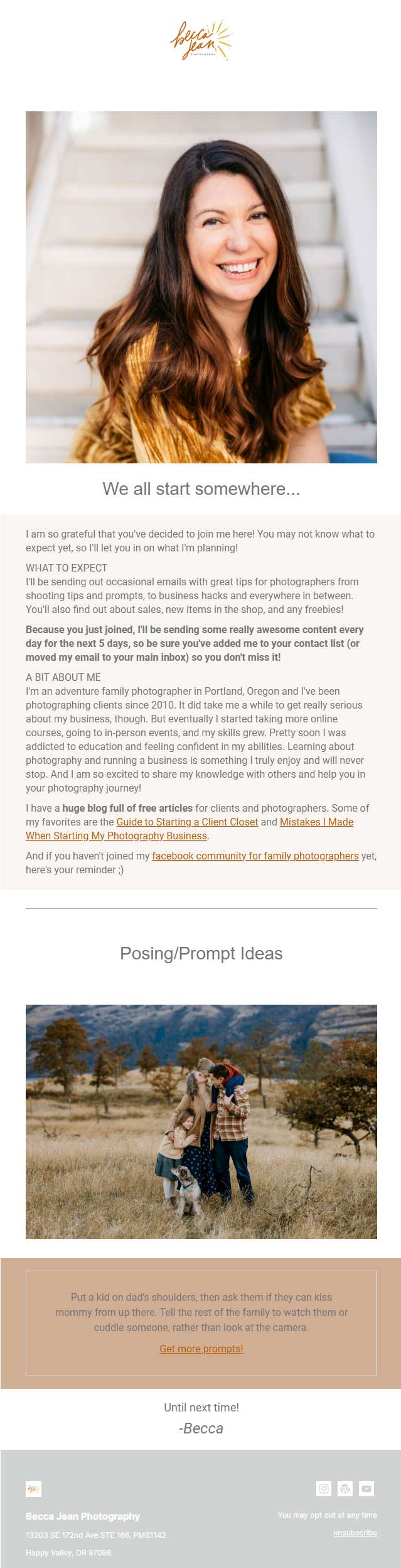 Let’s have some photography newsletter ideas! The following email photography example is a welcome email from Becca Jean Photography. She is a photographer who has sent this welcome email to her new email newsletter subscriber. This email content is about her photography business and thoughts to help new subscribers get familiar. The content is well-organized, providing clear details on what to do and what subscribers can expect from their email newsletters. It also provided posing/prompt ideas with a catchy photograph image in the email.