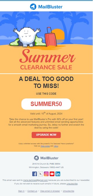 - The email body part is well organized. Its message is engaging and concise, and a CTA “Upgrade now” button is attached.